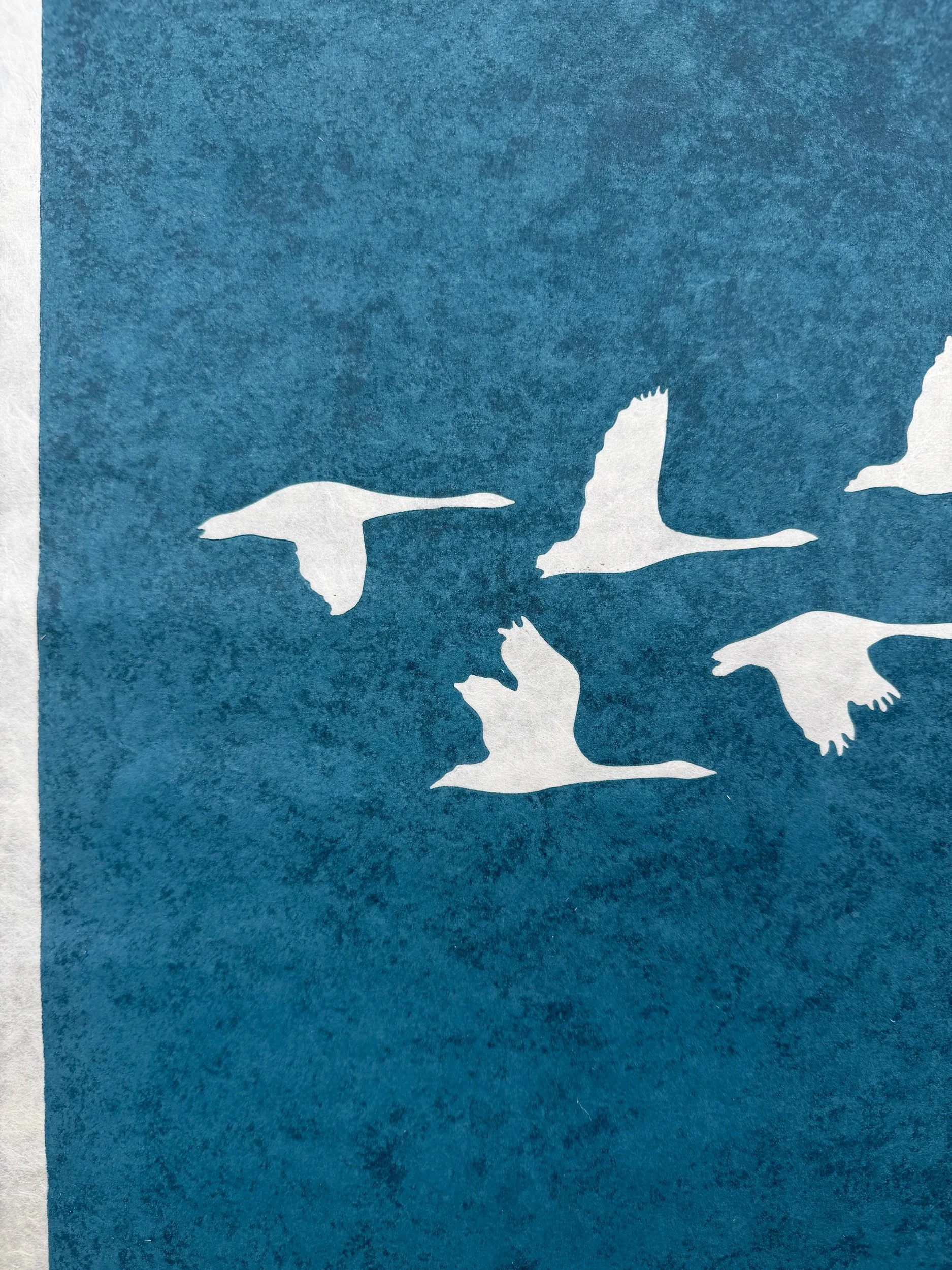 Handgedruckter Linolschnitt ,der Gesang der wilden Schwäne‘ auf handgeschöpftem Loktapapier.