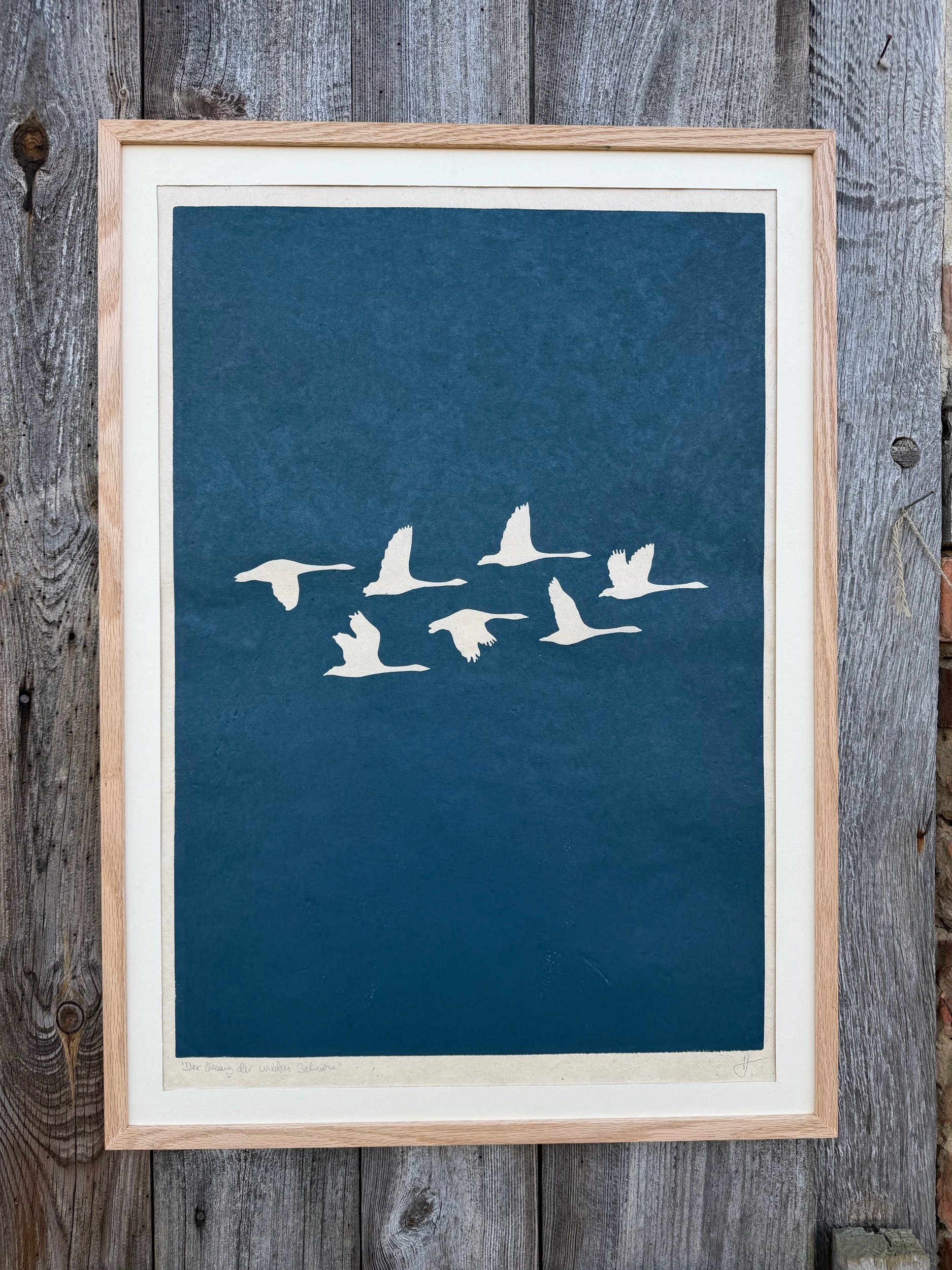 Handgedruckter Linolschnitt ,der Gesang der wilden Schwäne‘ auf handgeschöpftem Loktapapier.