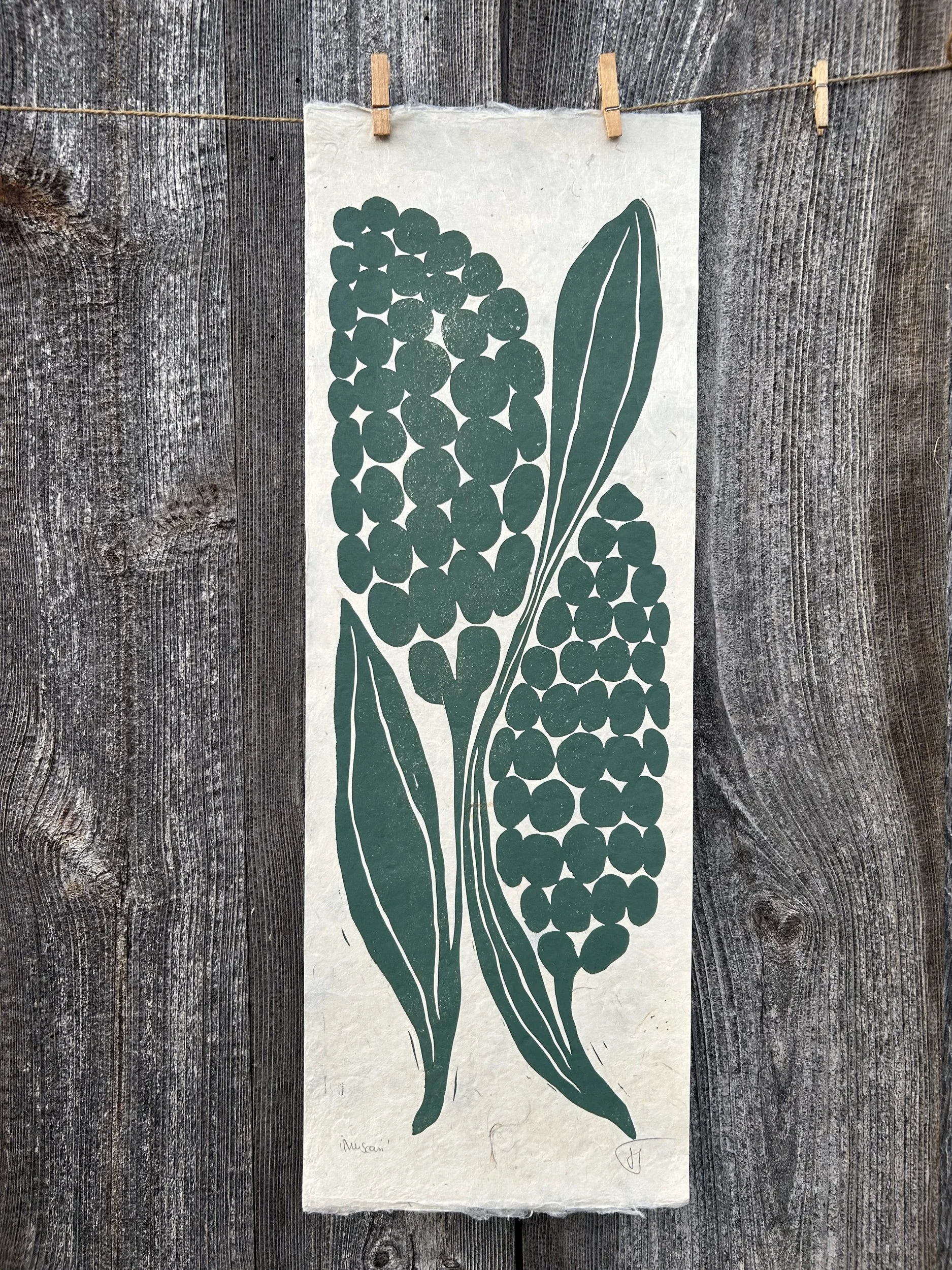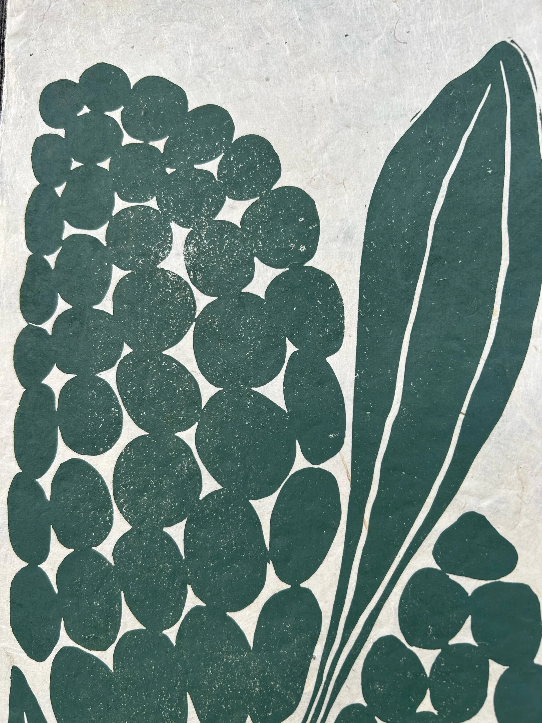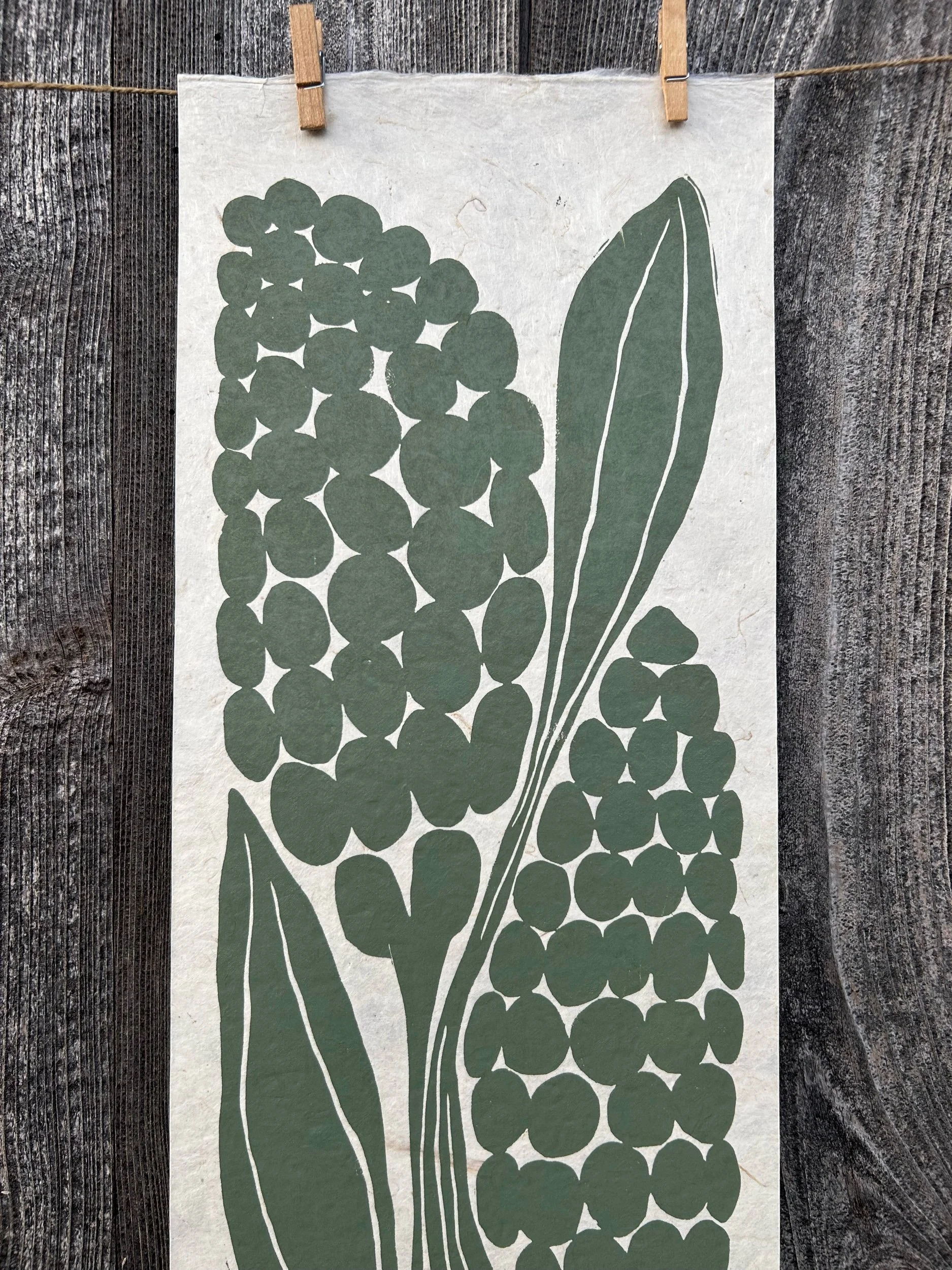 Handgedruckter Linolschnitt ‚Muscari’ (Traubenhyazinthe) auf handgeschöpftem Loktapapier.