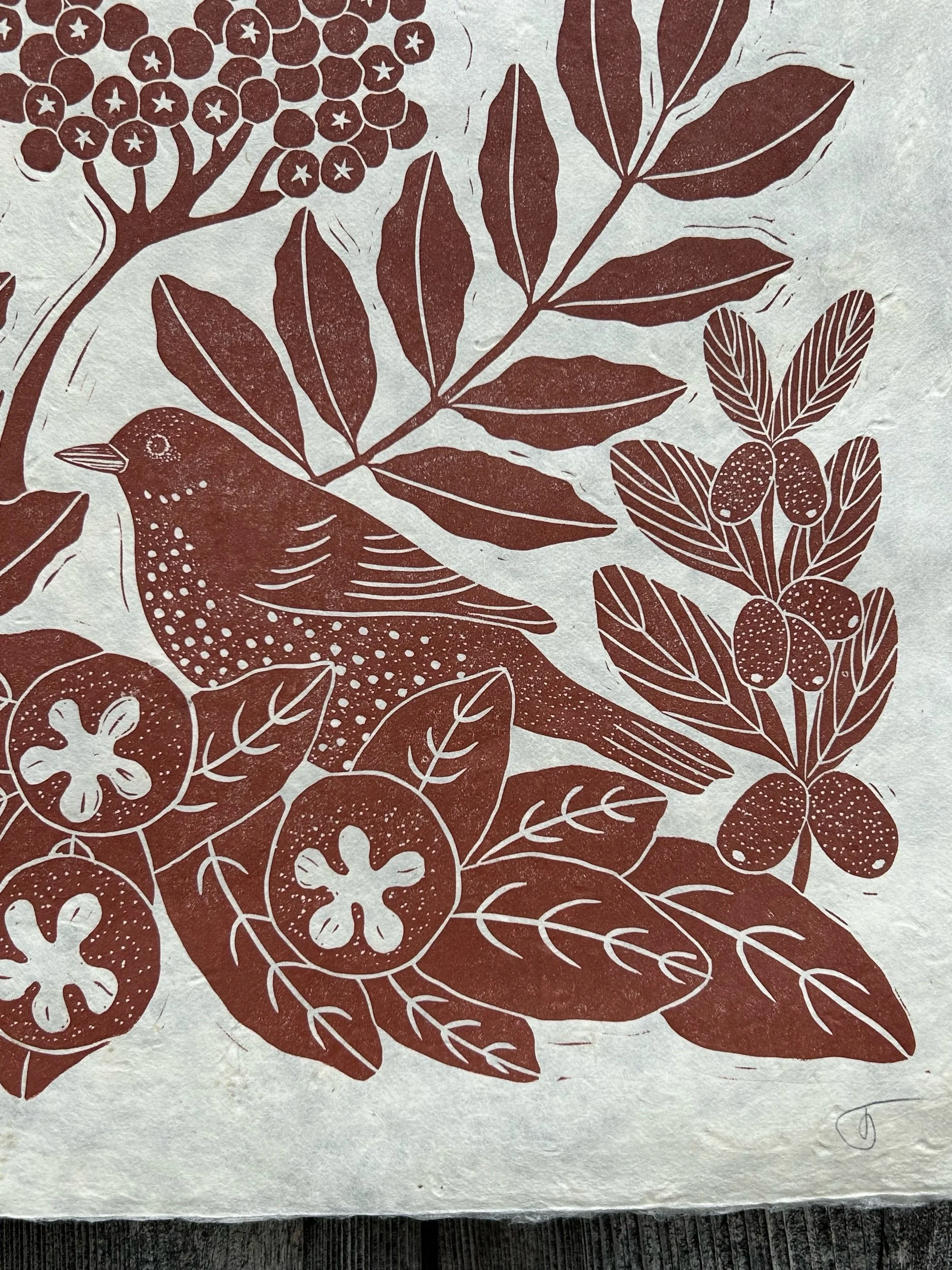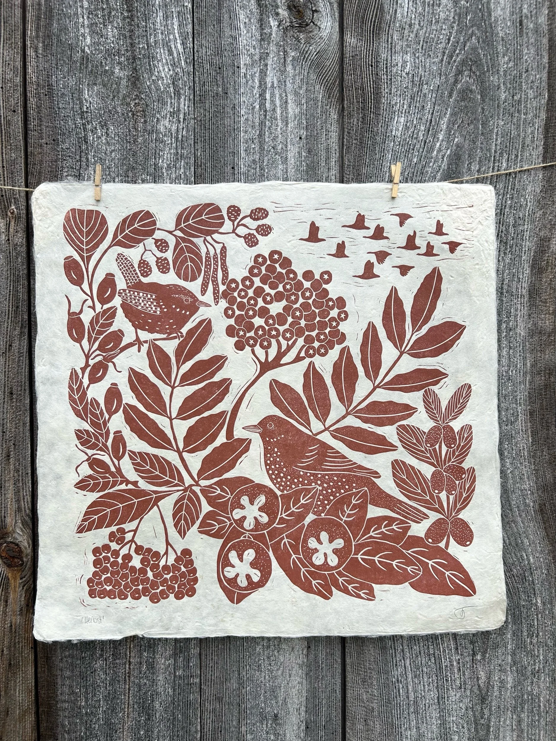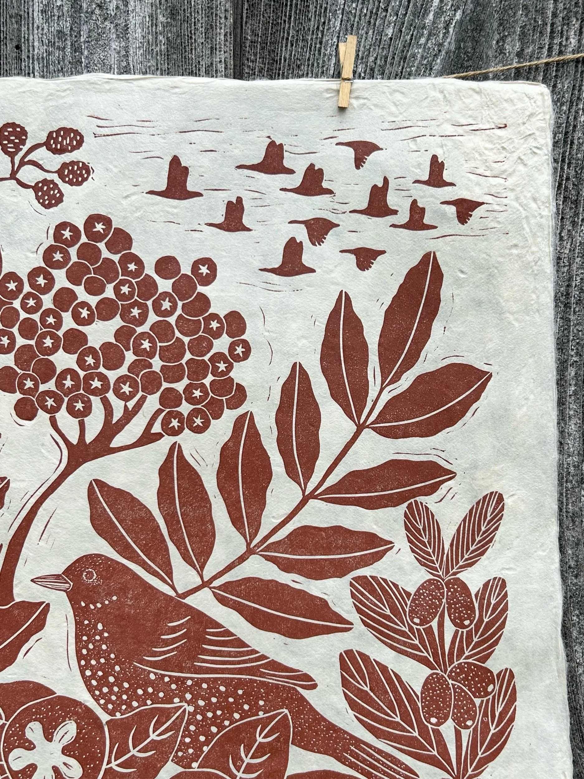 Handgedruckter Linolschnitt ,Herbst‘ auf handgeschöpftem Loktapapier.