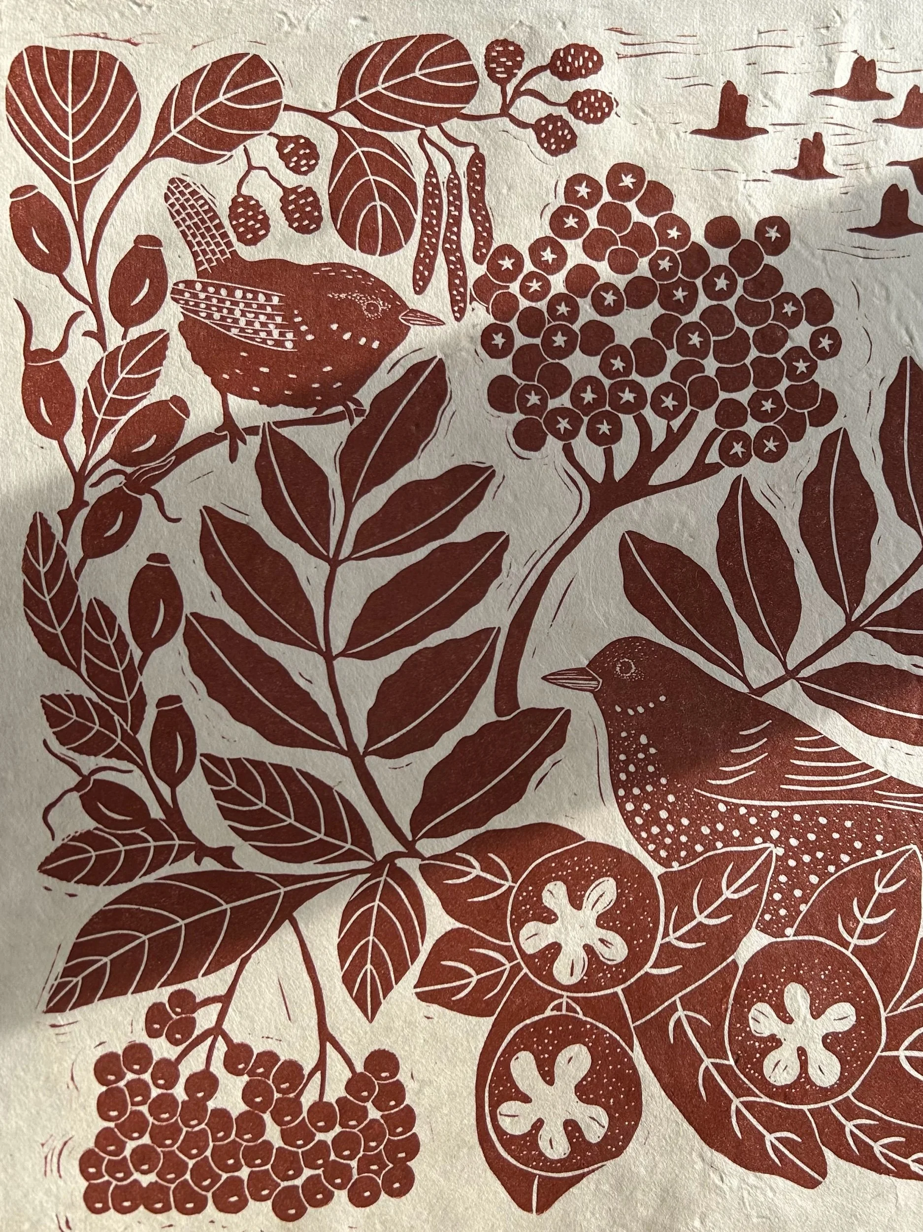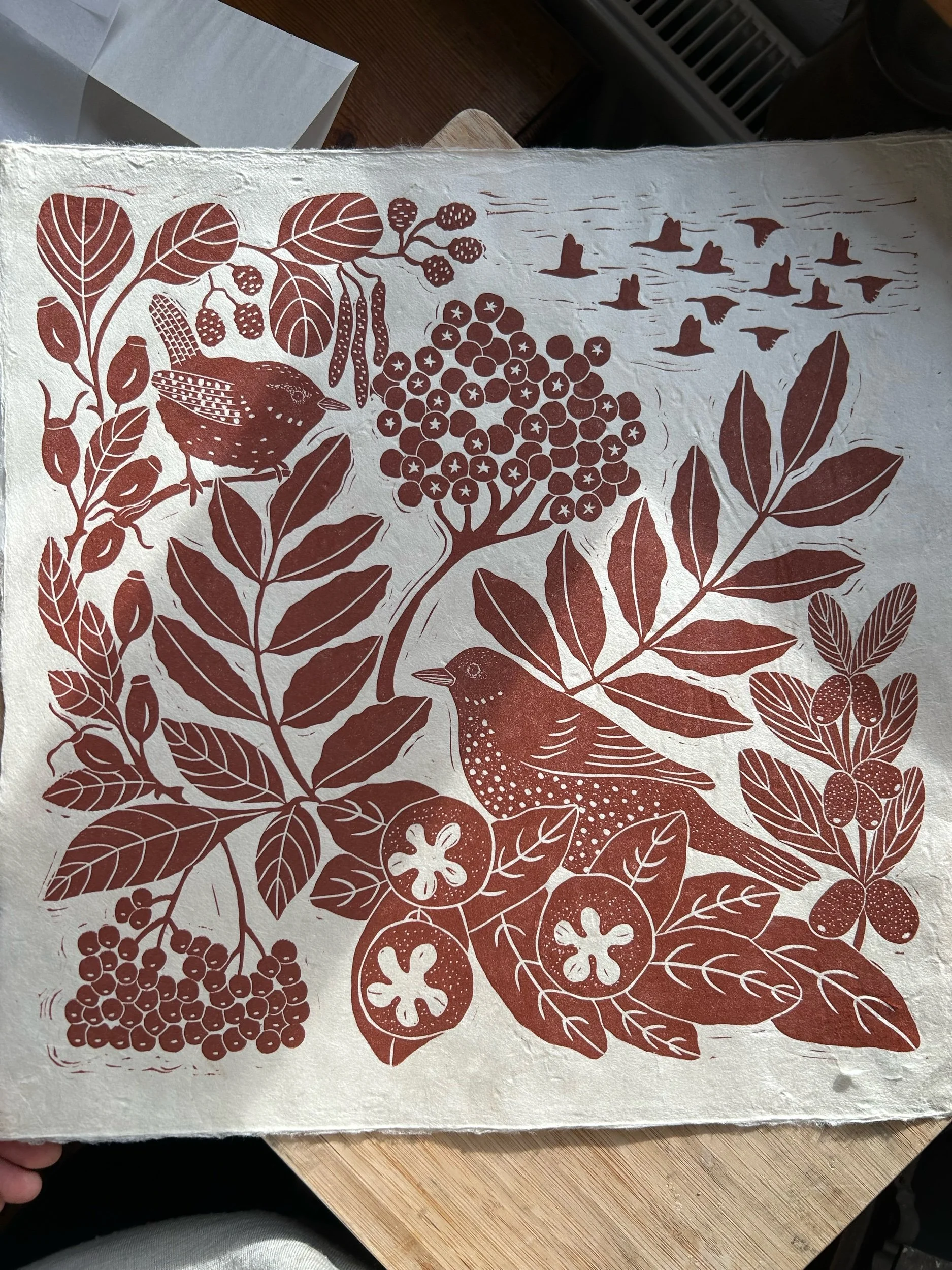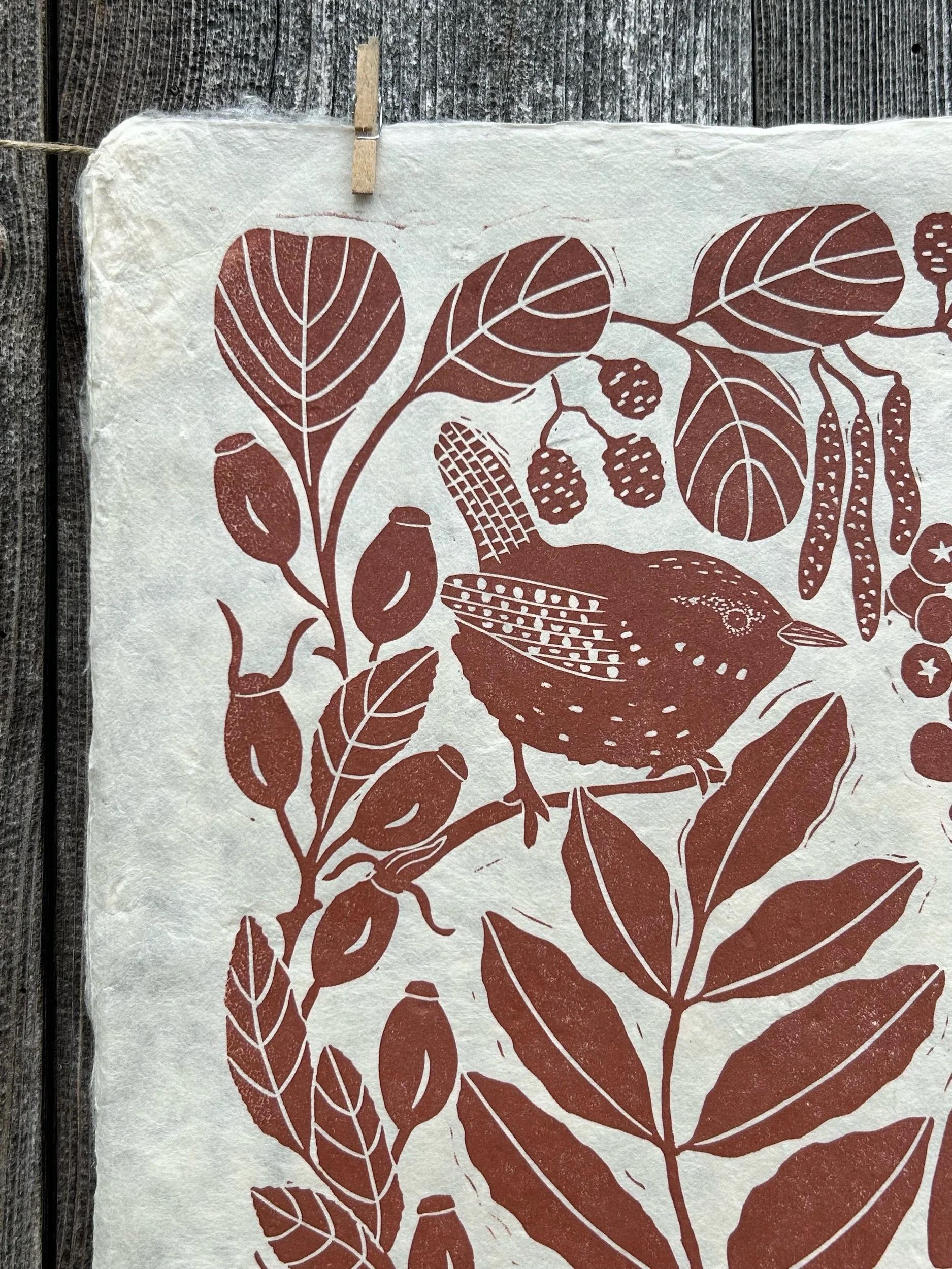 Handgedruckter Linolschnitt ,Herbst‘ auf handgeschöpftem Loktapapier.