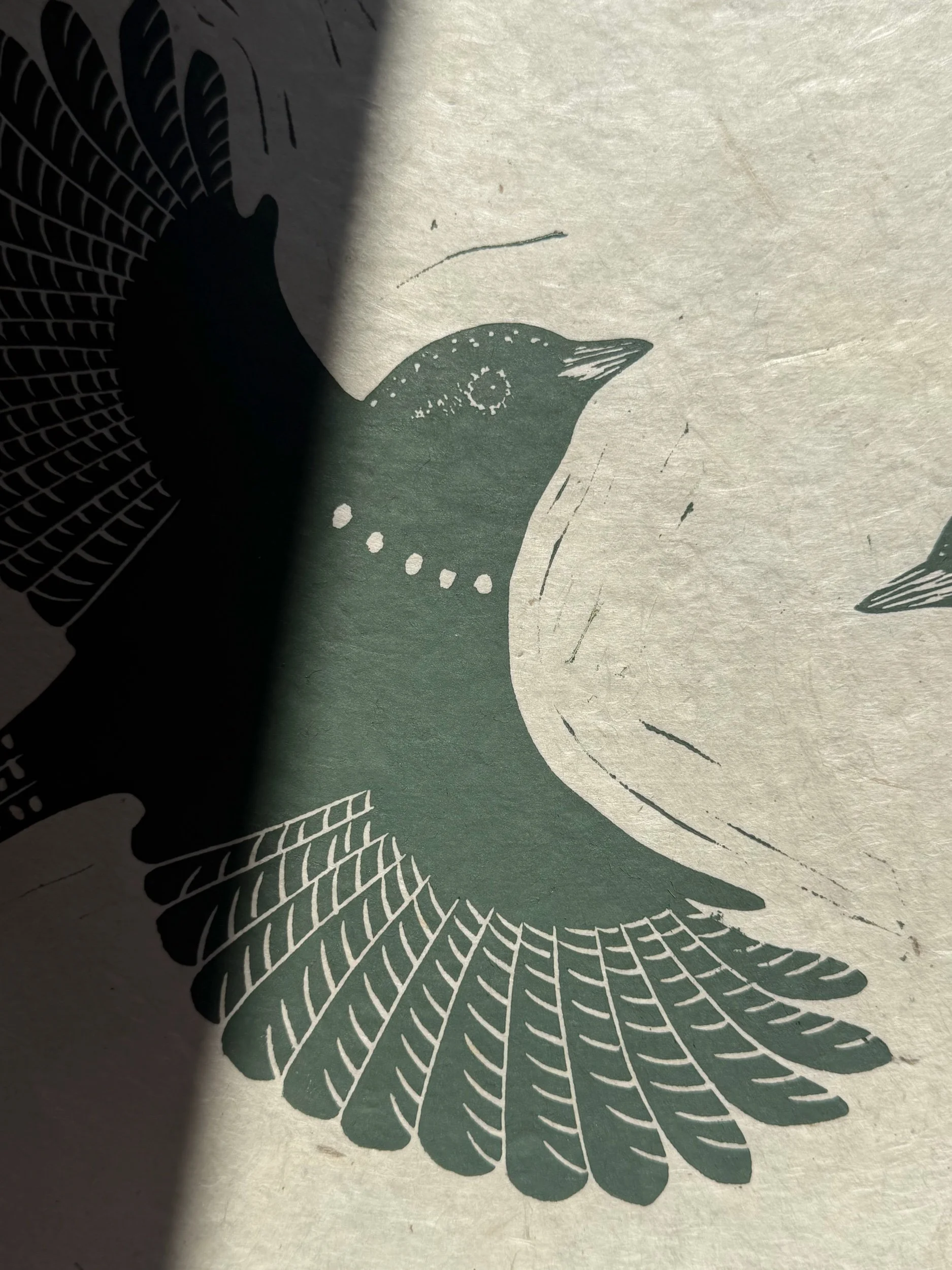 Ich drucke auf handgeschöpftem, stark strukturiertem Loktapapier. Dieses Papier hat eine wunderschöne unebene Haptik, daher gibt es auch Unebenheiten beim Druck. Das ist gewollt, somit gleicht kein Druck dem anderen.