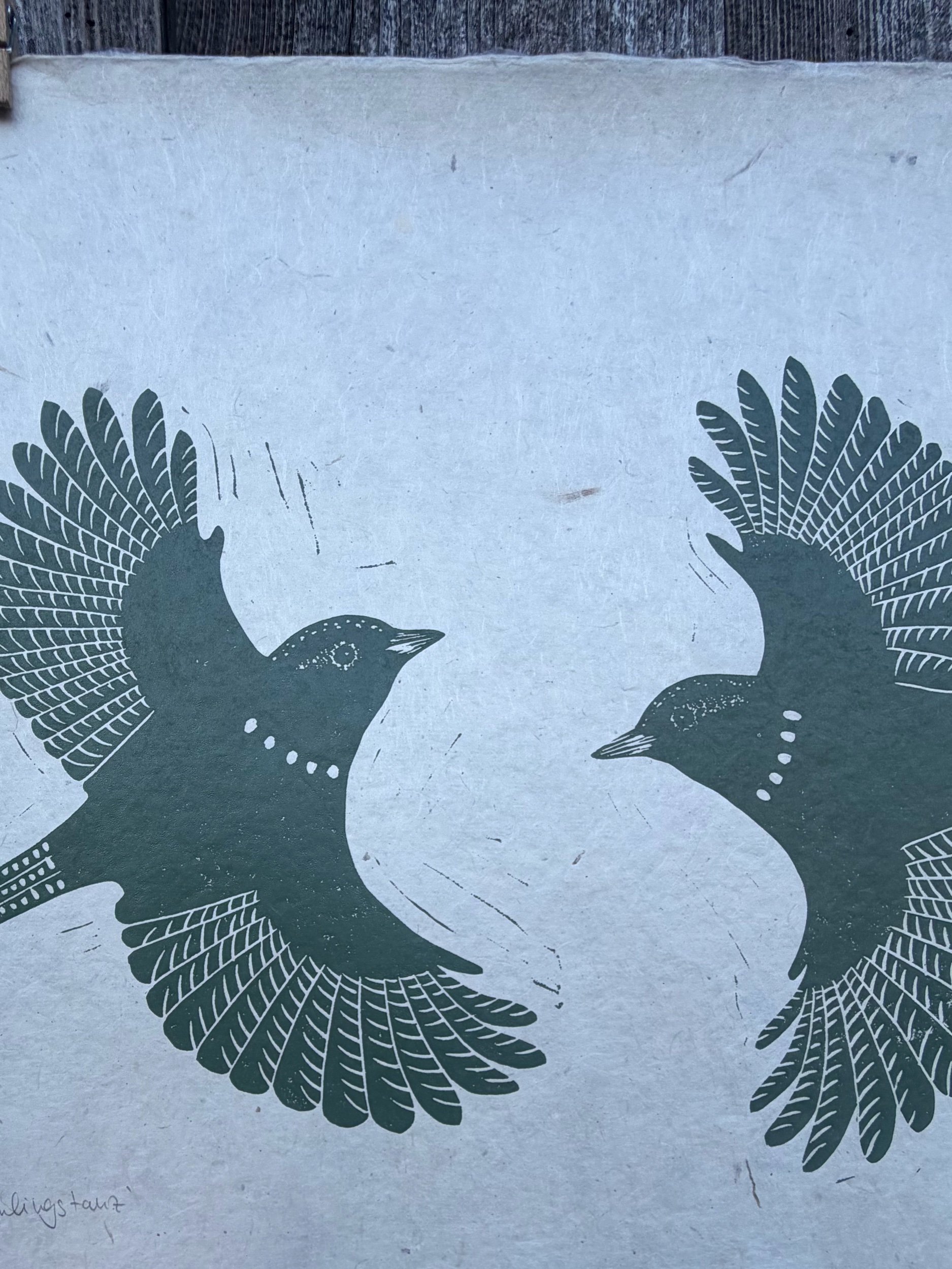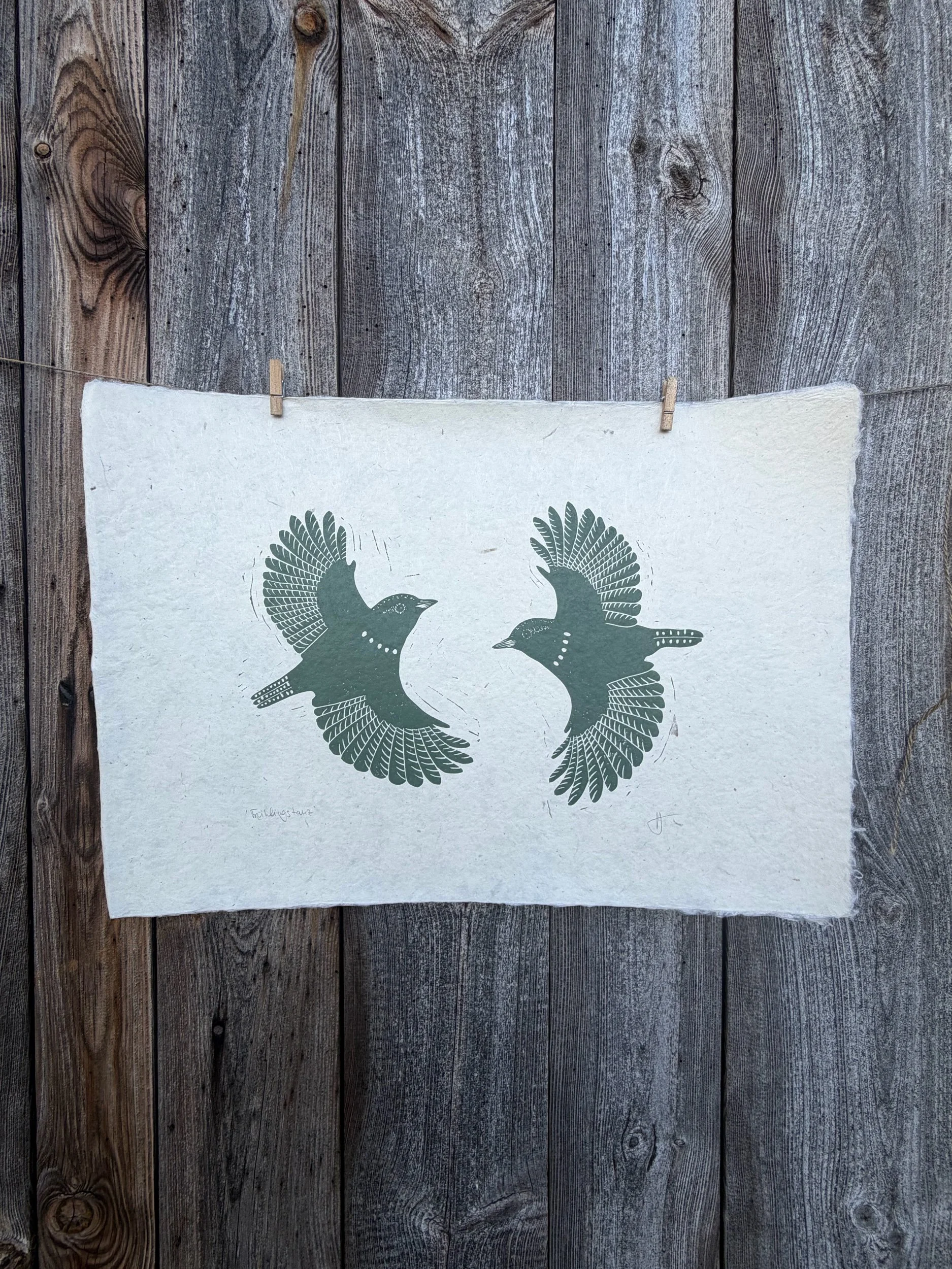 Handgedruckter Linolschnitt „Frühlingstanz“ auf handgeschöpftem Loktapapier.