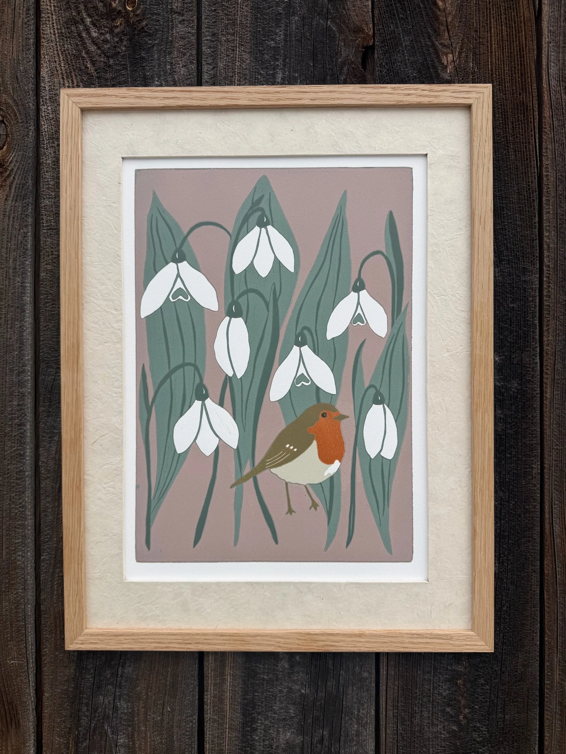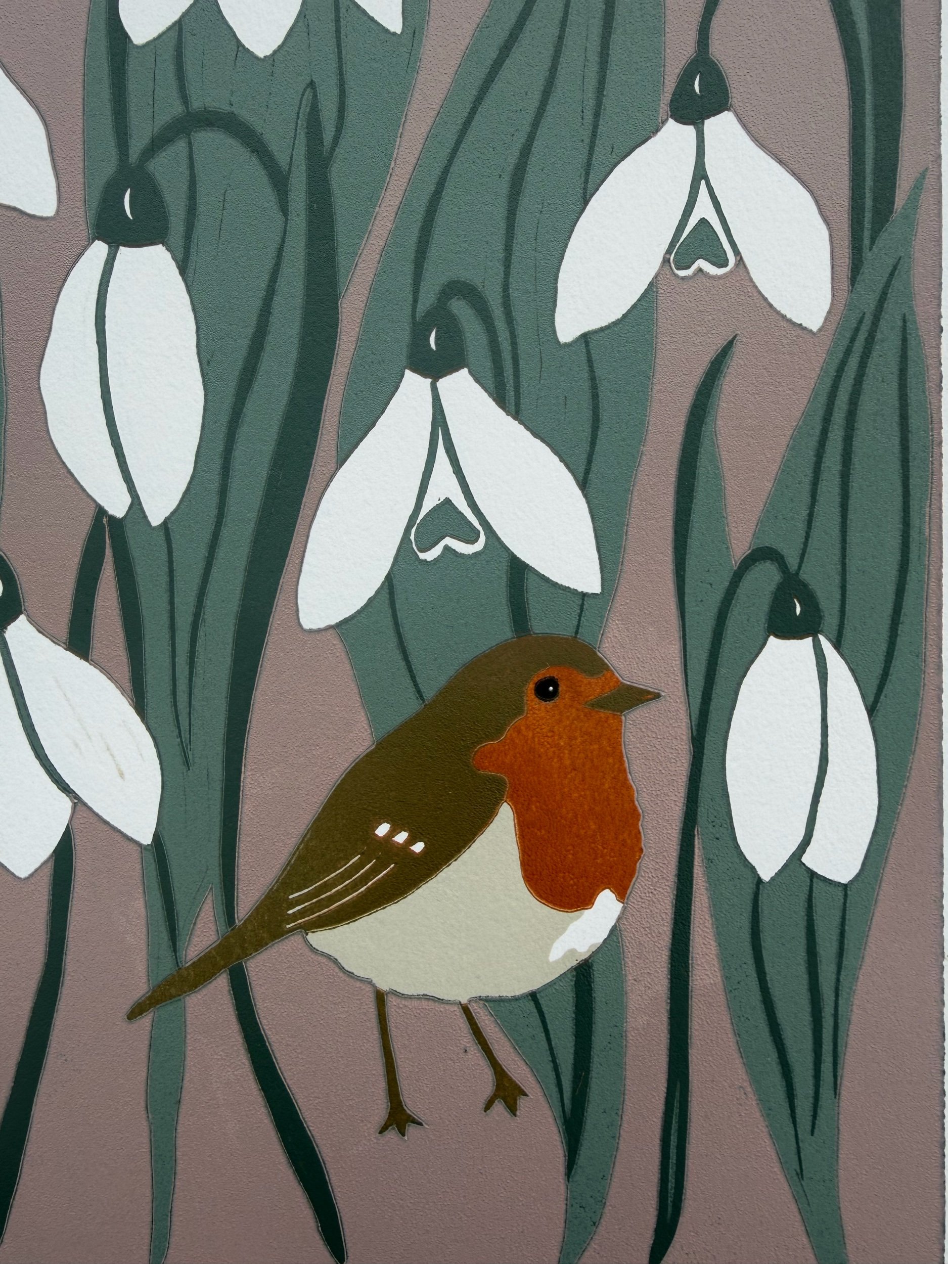 Handgedruckter Linolschnitt „Frühlingsbotin“ auf Rives Büttenpapier, Auflage von 2 Stück.