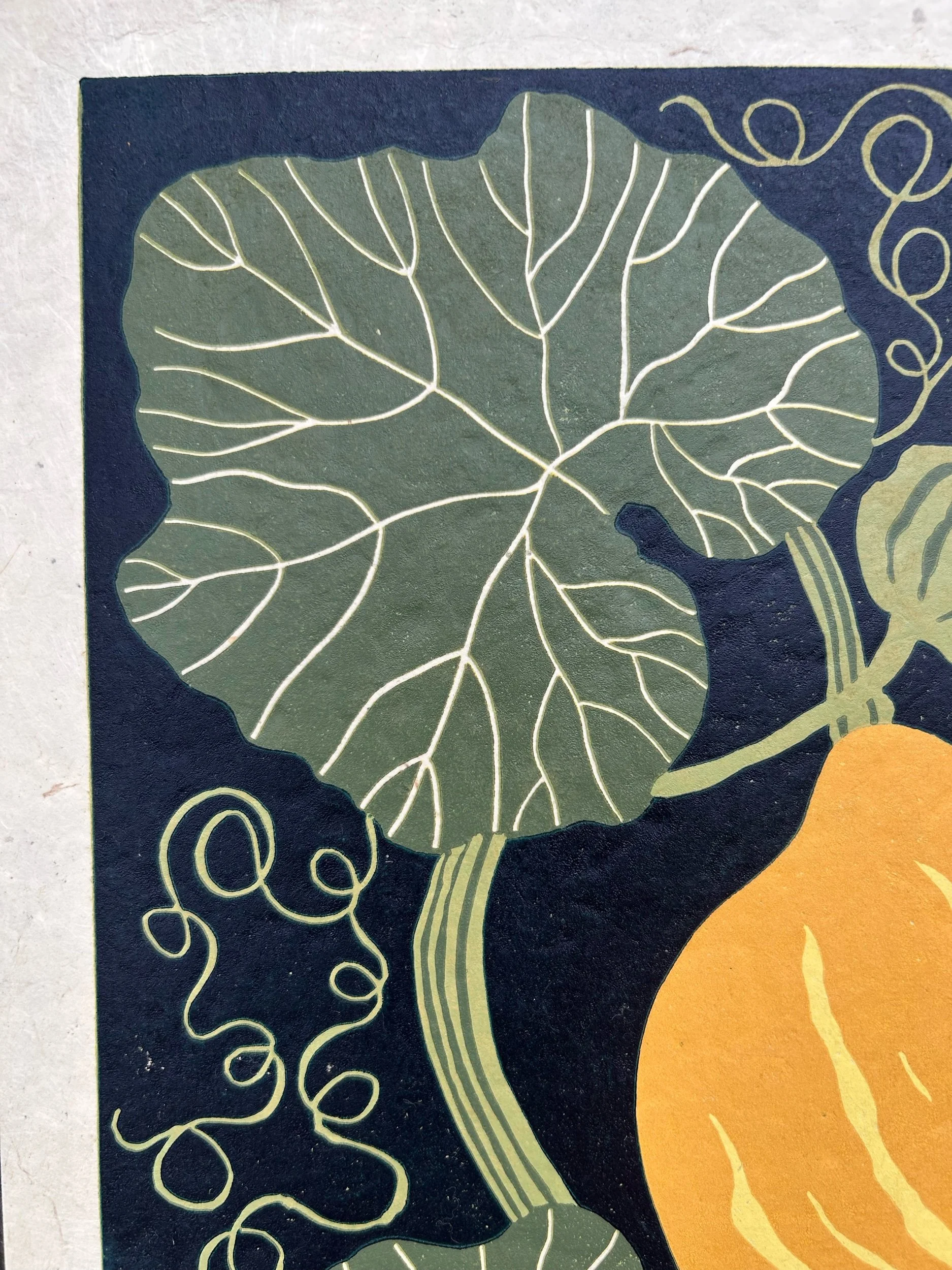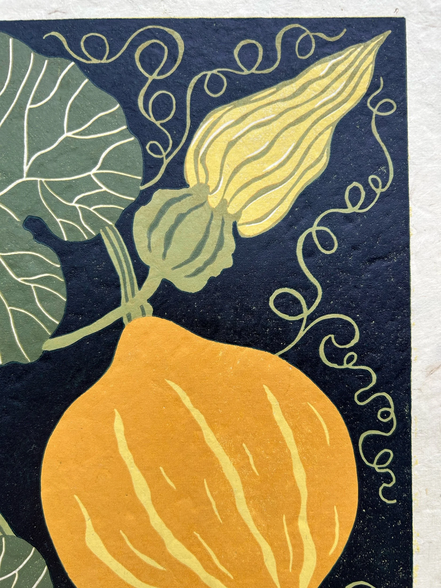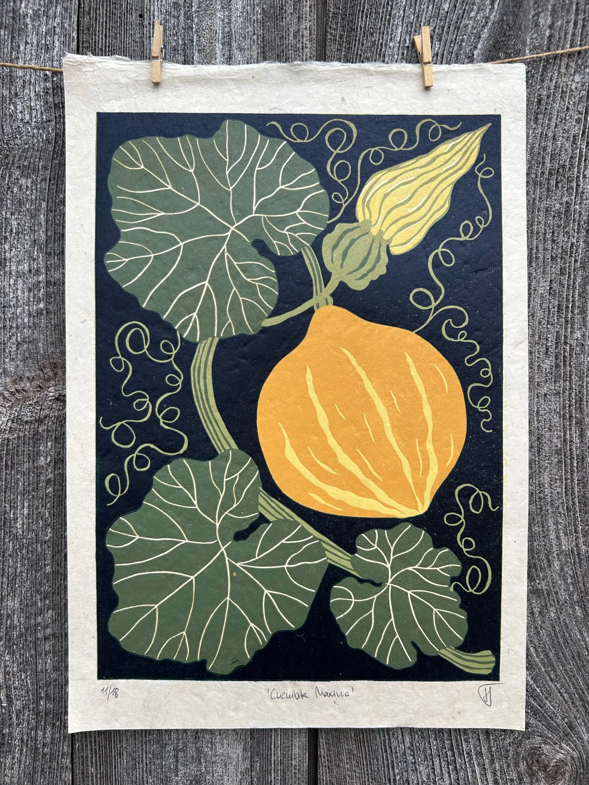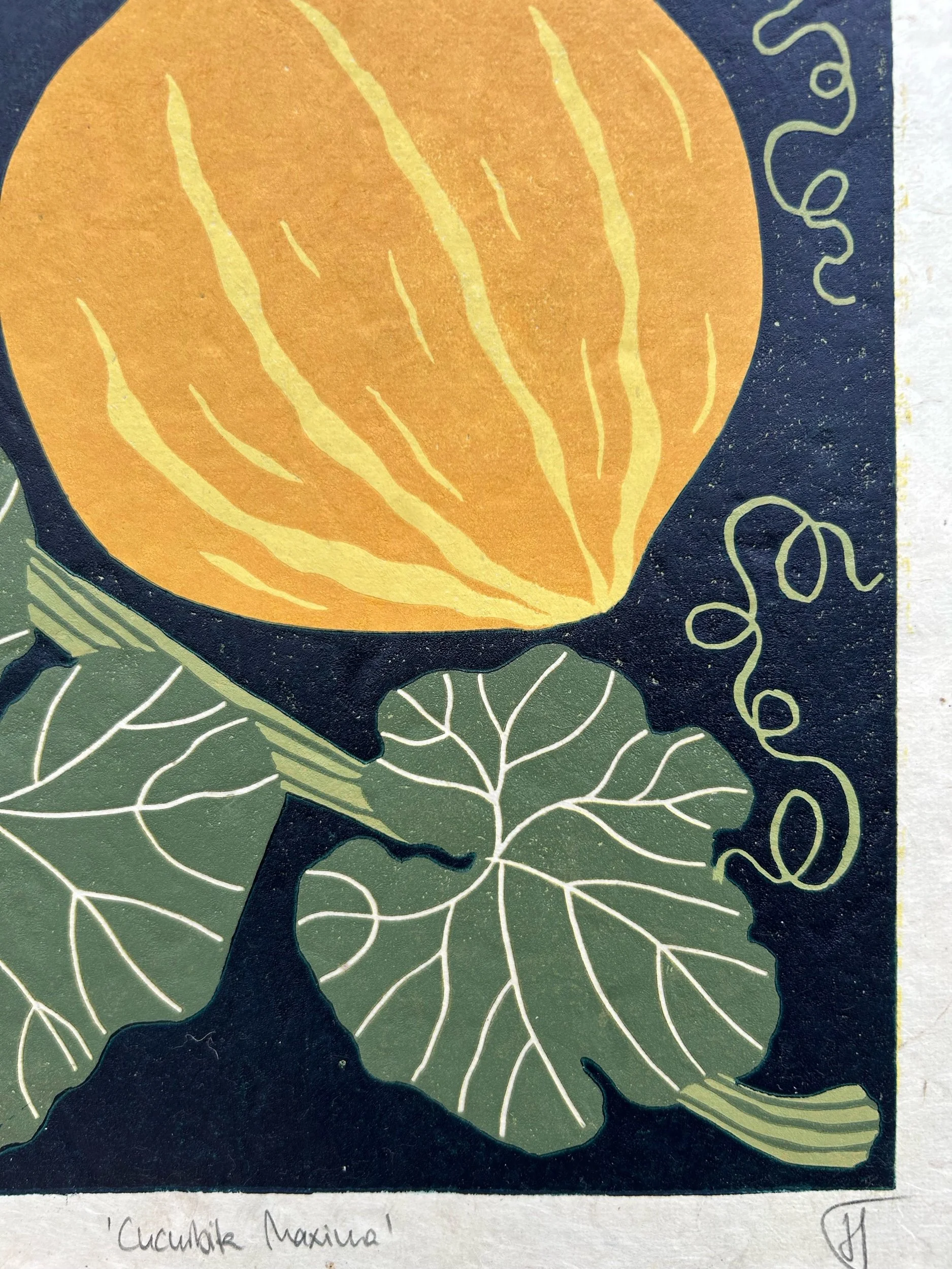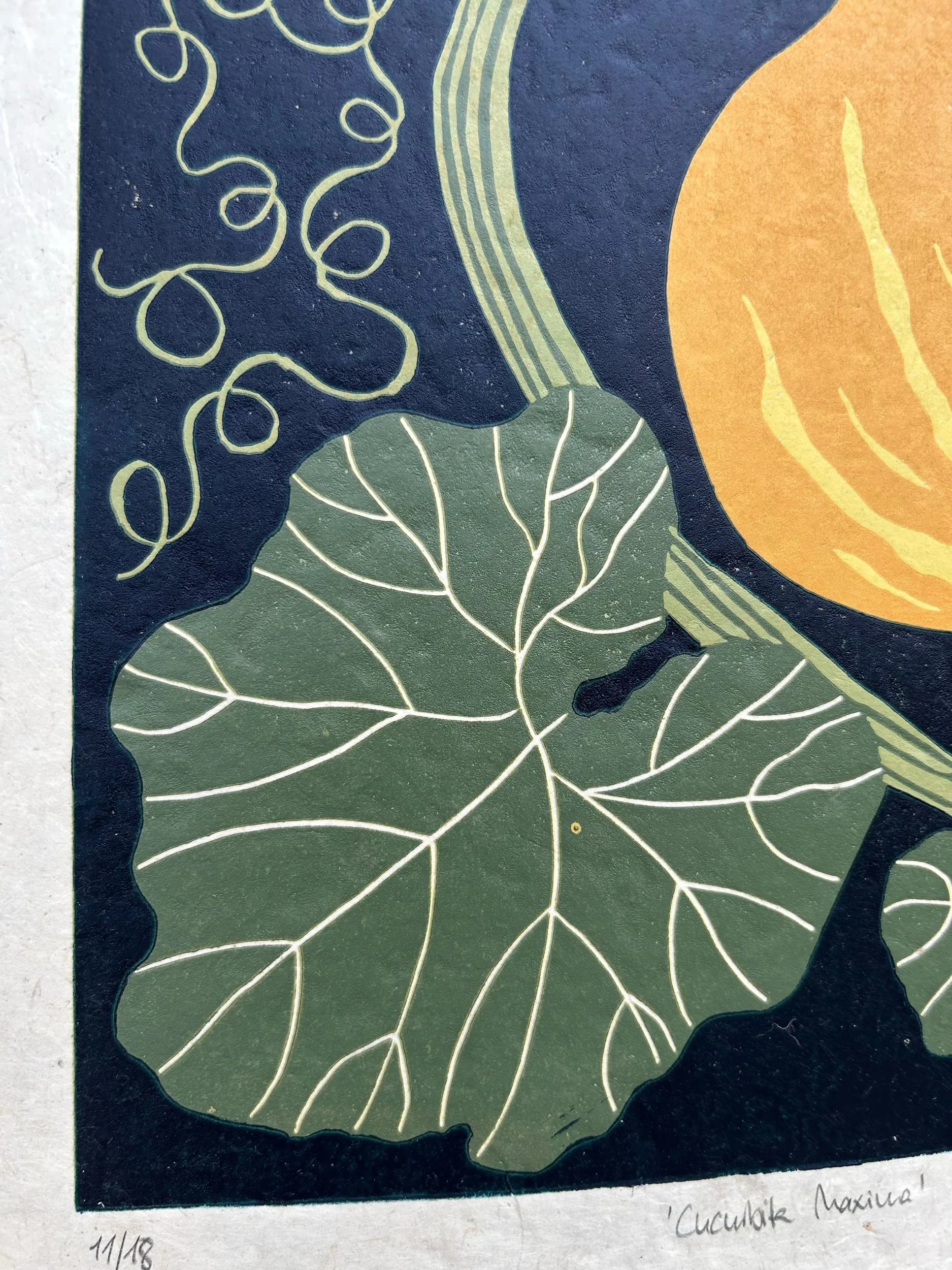 Handgedruckter Linolschnitt „Cucurbita maxima“ mit 5 Farben.