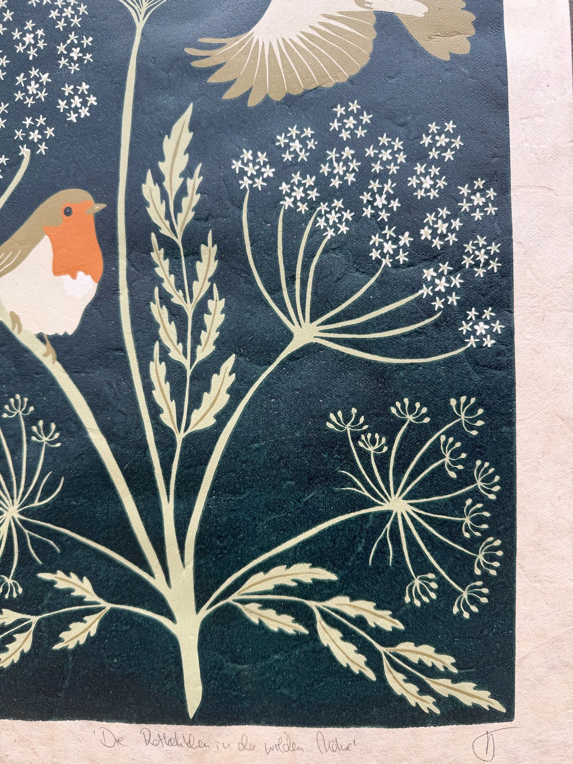 Handgedruckter Reduktions-Linolschnitt „Die Rotkehlchen in der wilden Möhre“ mit 6 Farben.