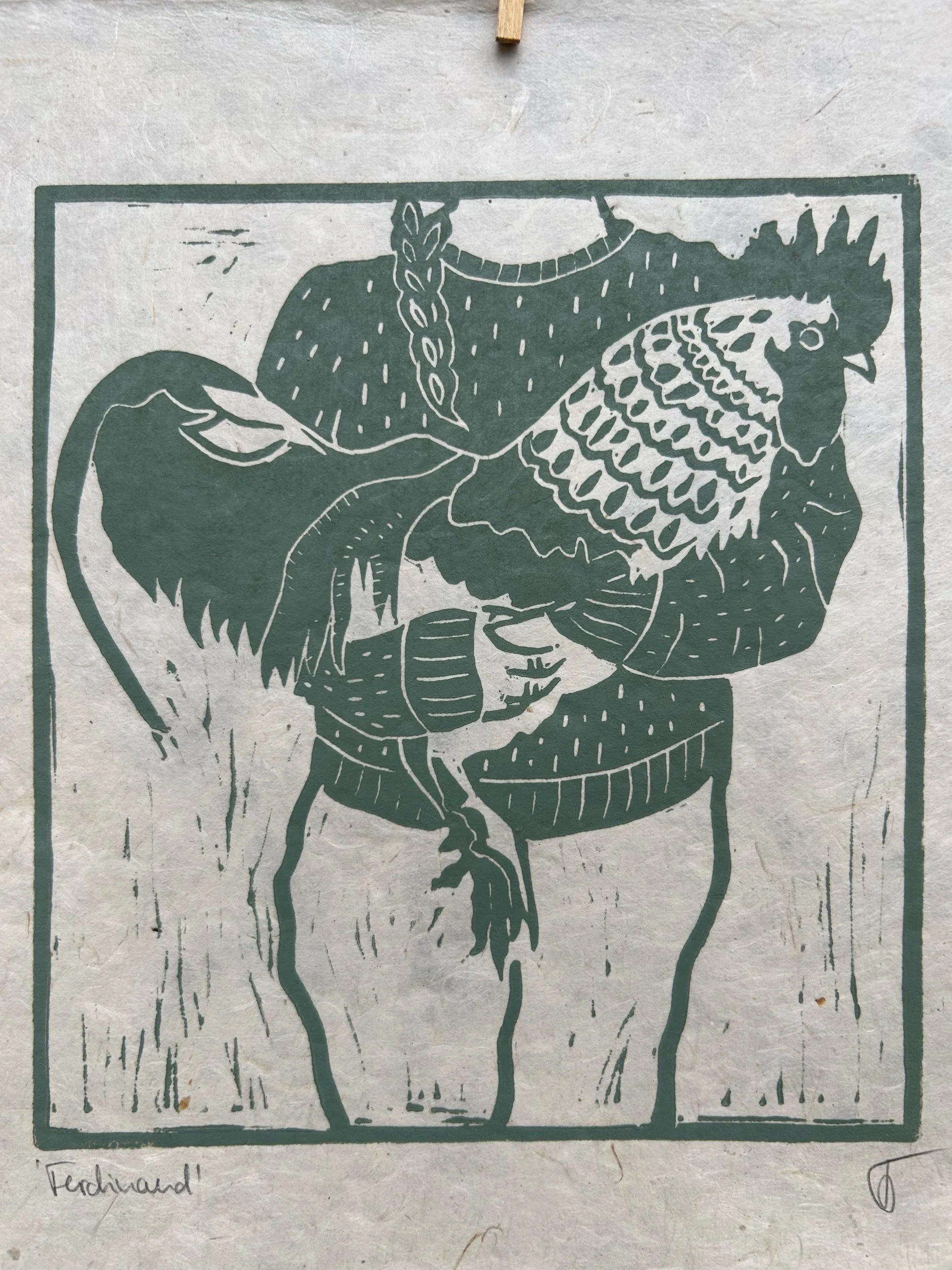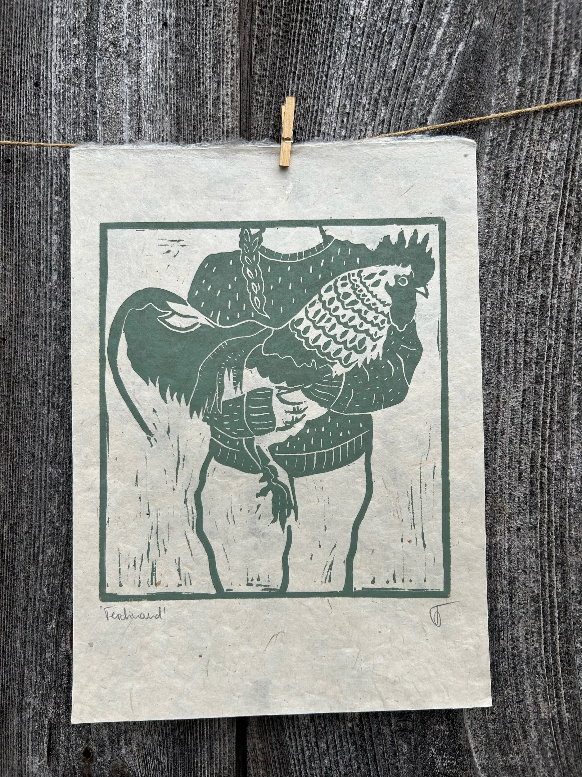 Handgedruckter Linolschnitt meines ersten Hahns Ferdinand in wunderschönem Salbeigrün.