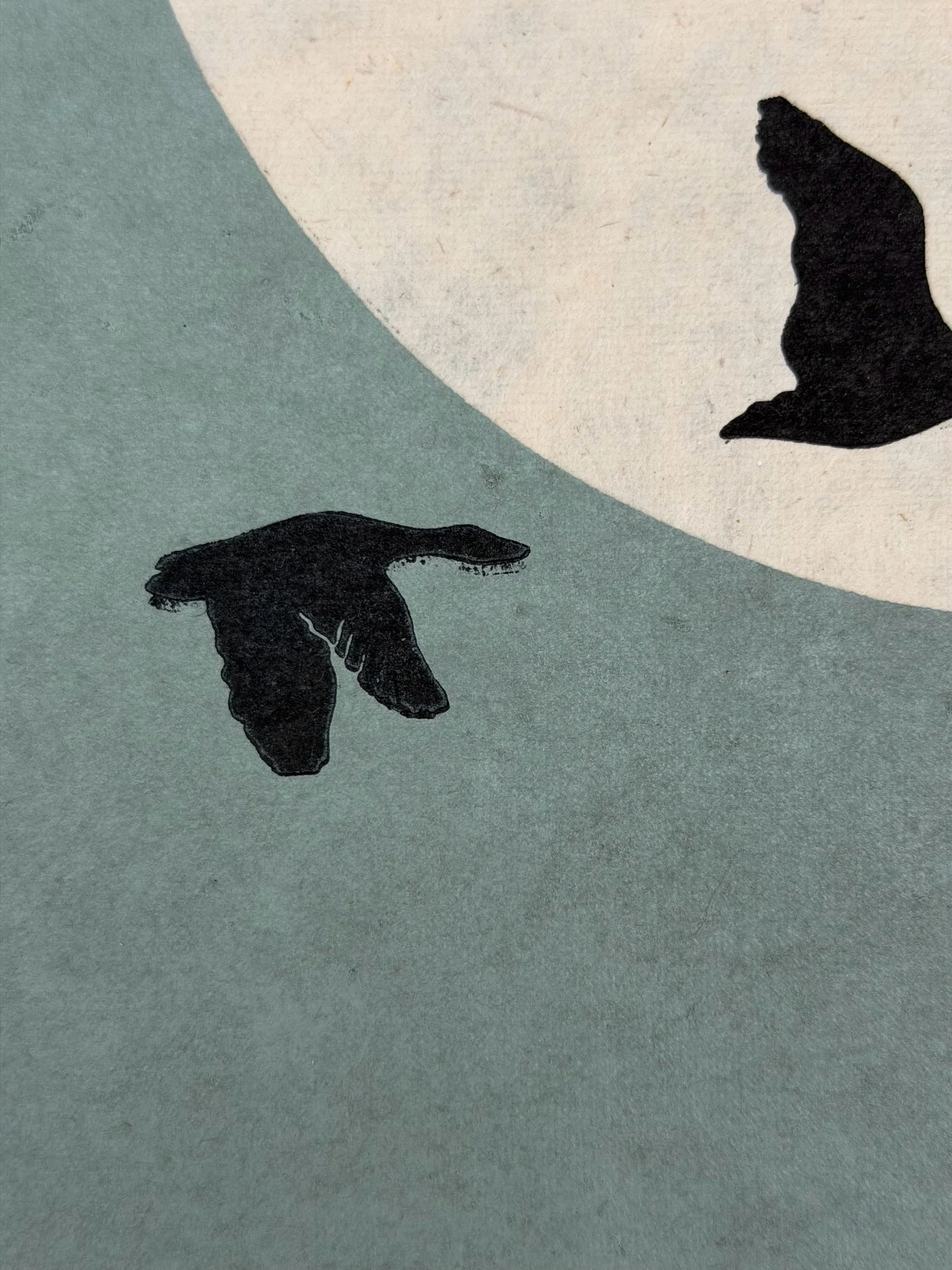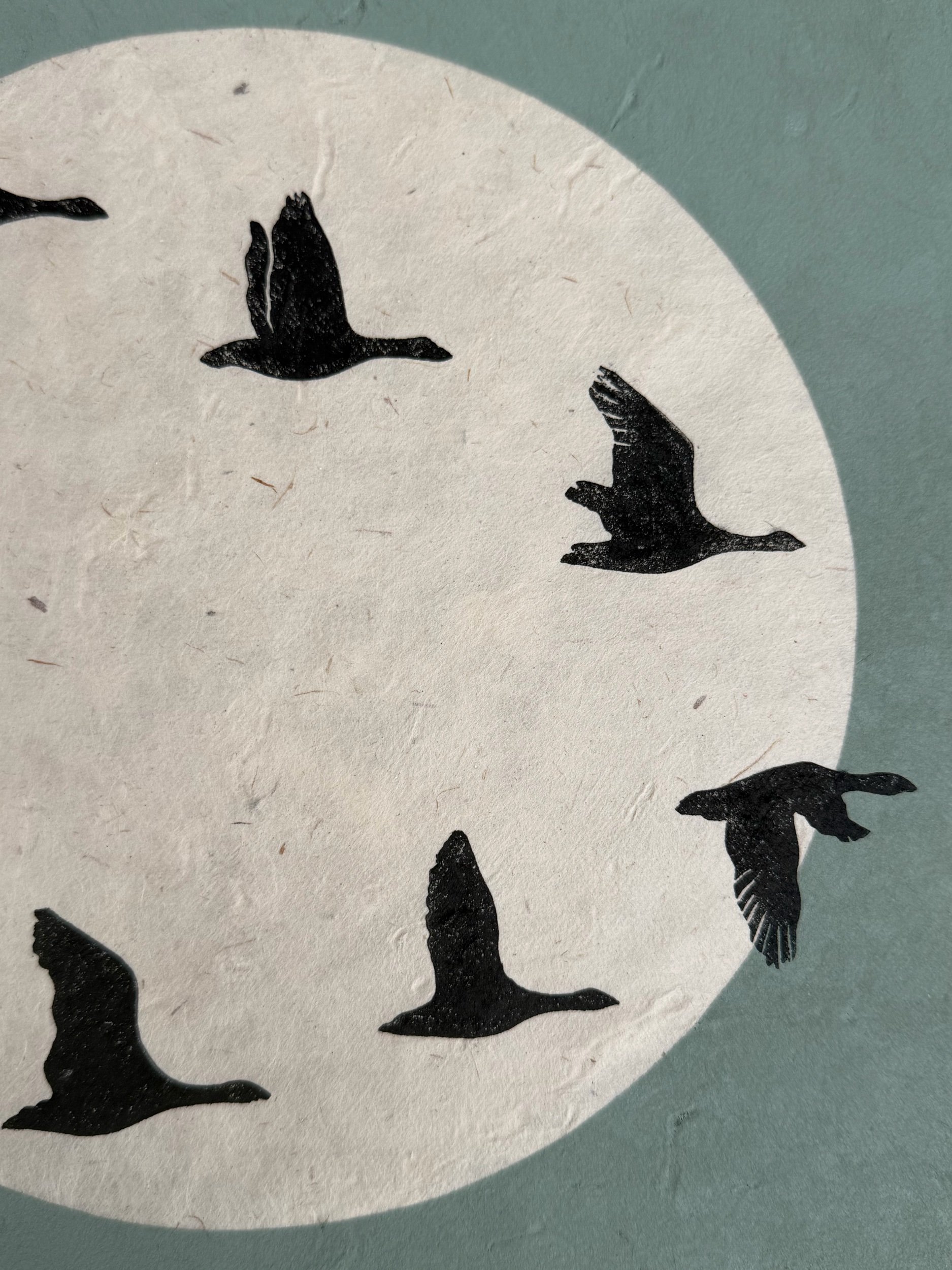 Handgedruckter Linolschnitt ,Mondgänse‘ auf handgeschöpftem Loktapapier.