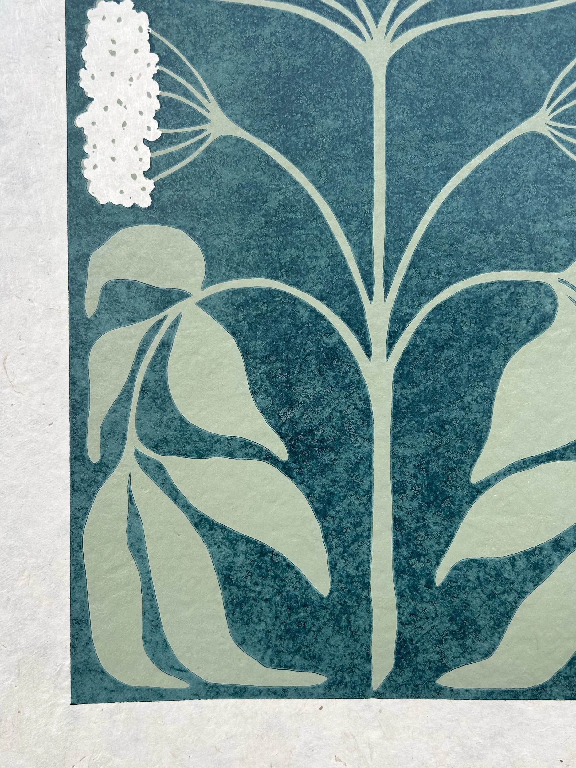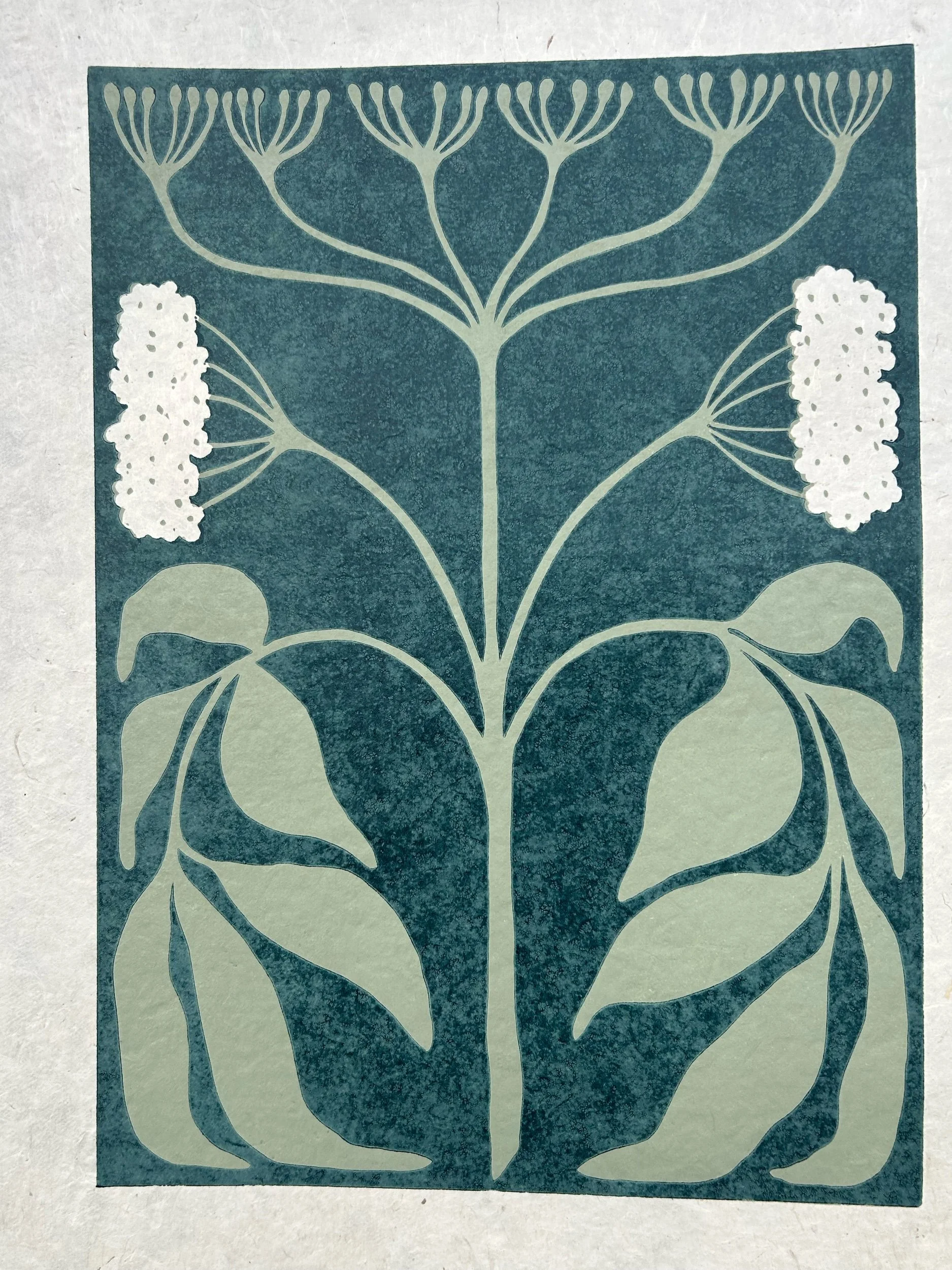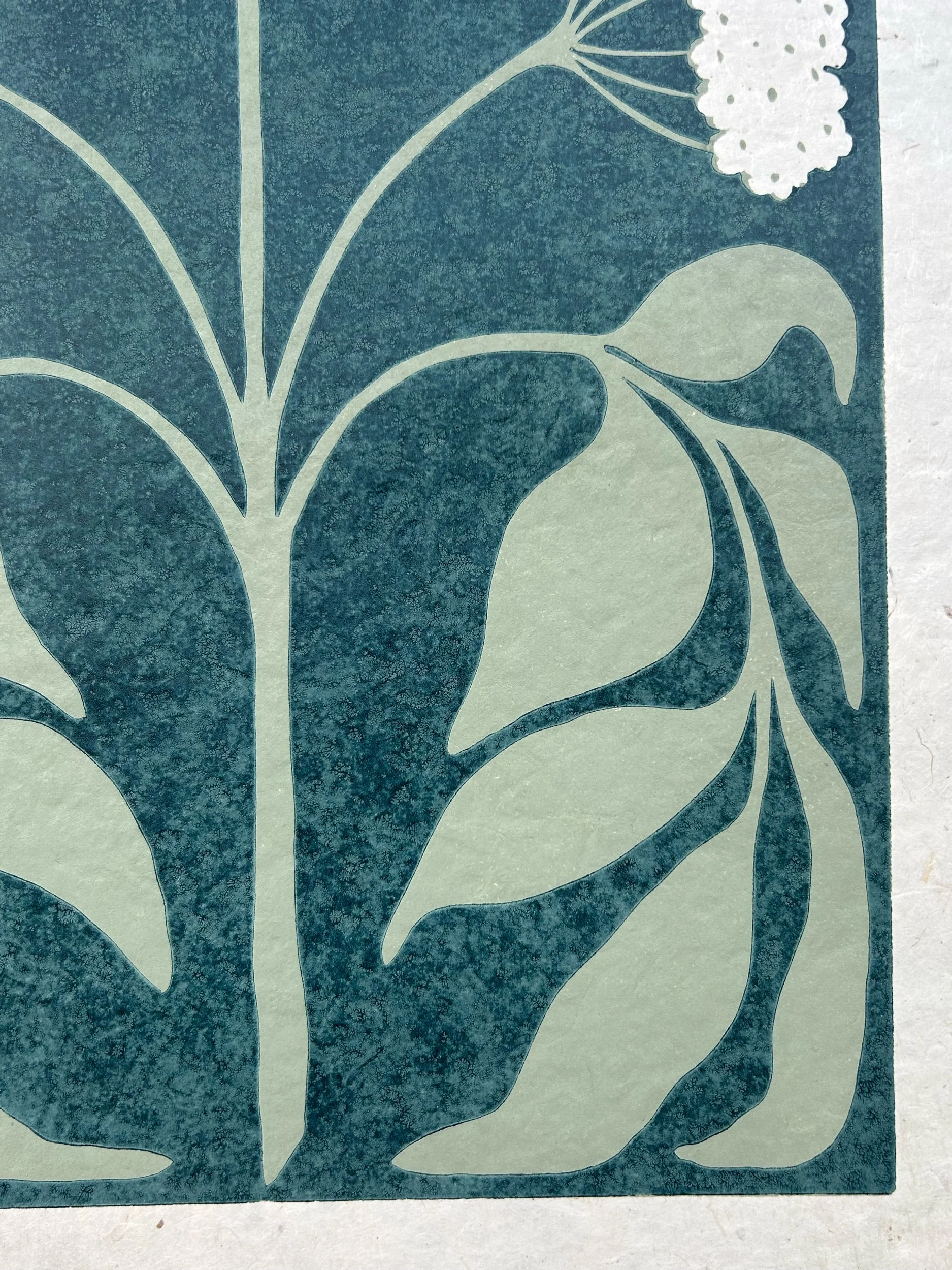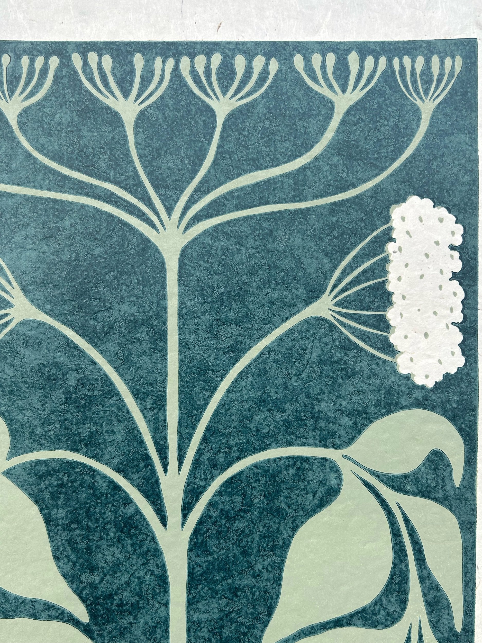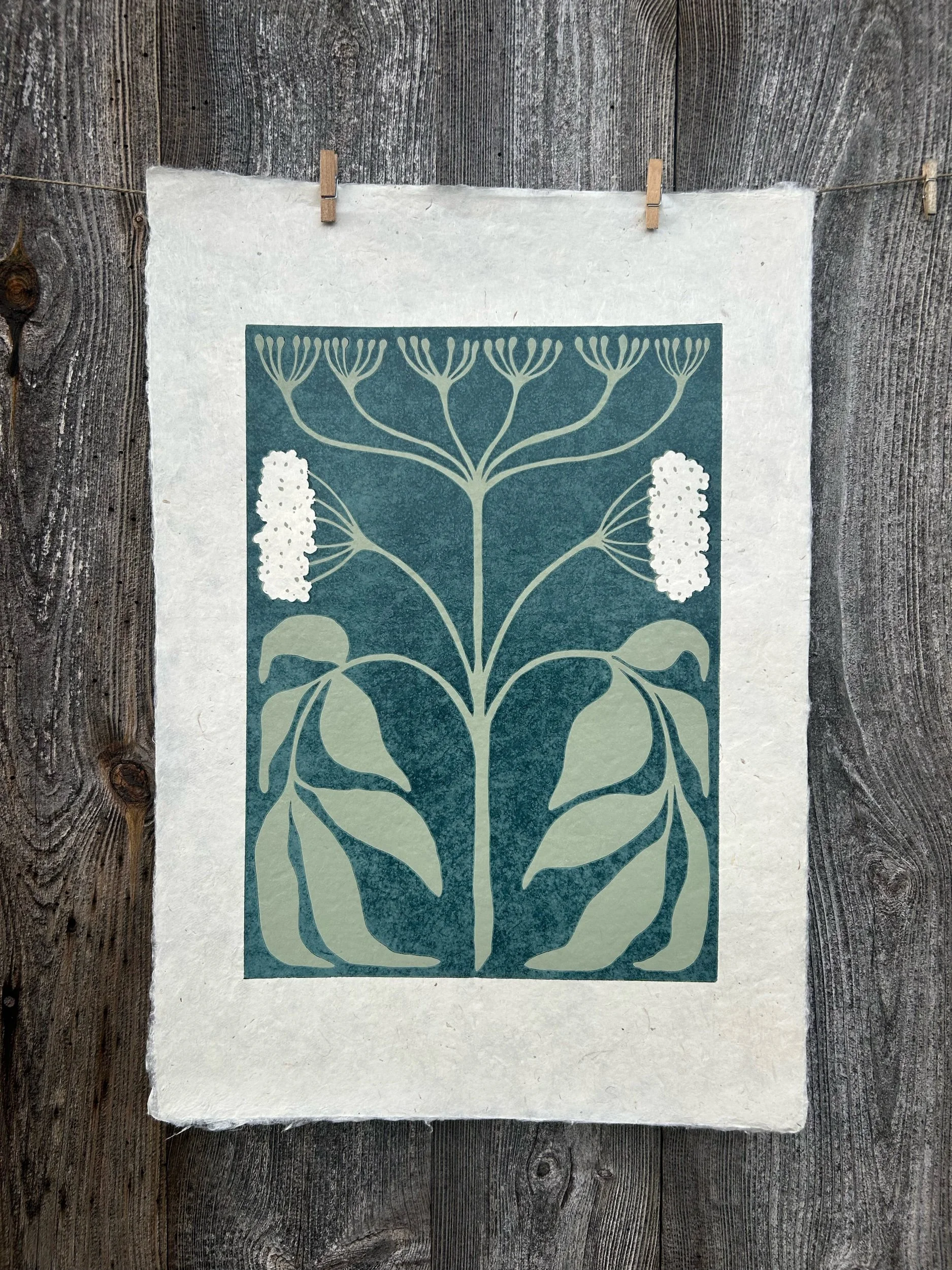 Handgedruckter 2-Platten-Linolschnitt ‚Aegopodium podagraria’, besser bekannt als Giersch, auf handgeschöpftem Loktapapier.