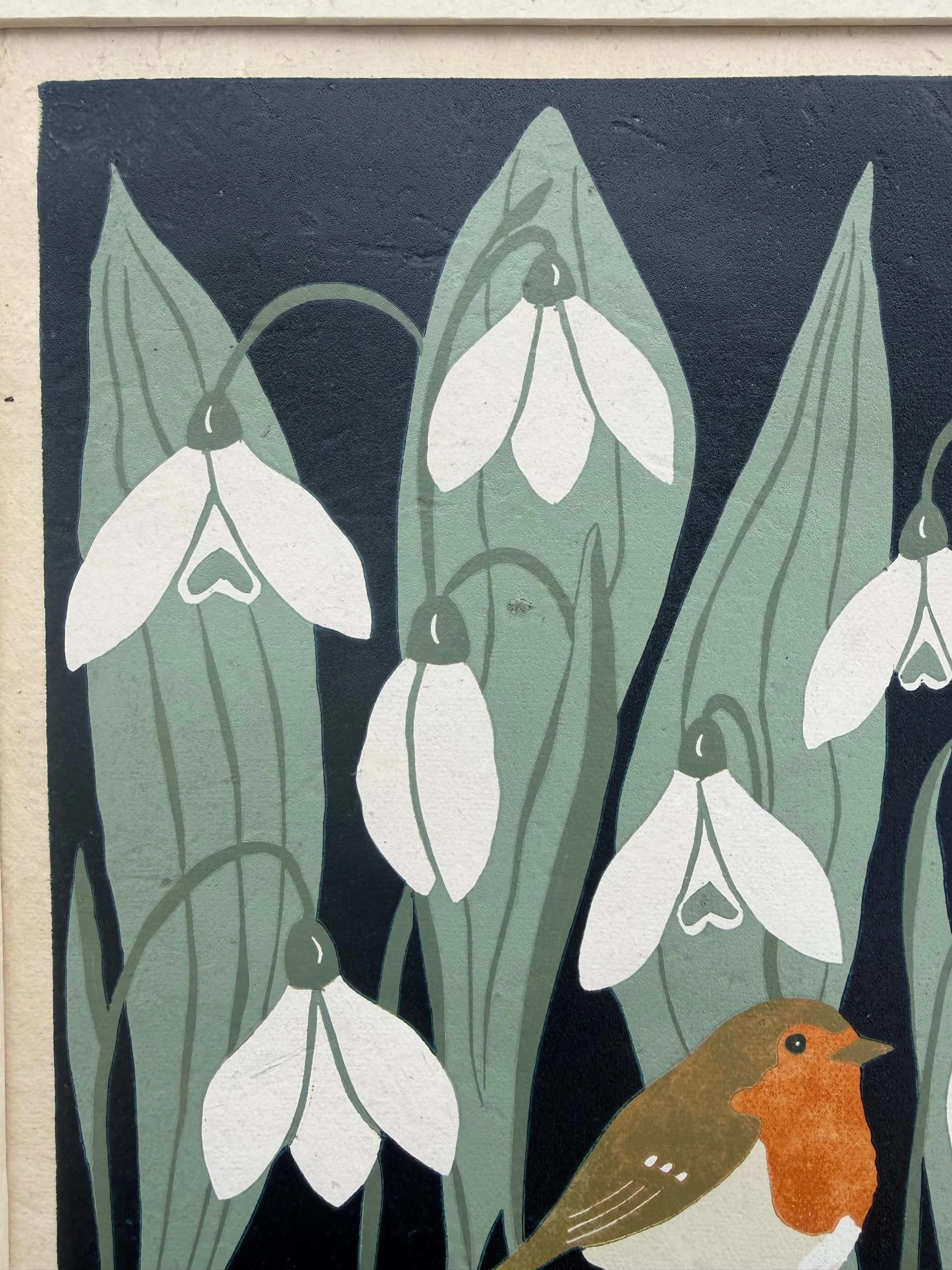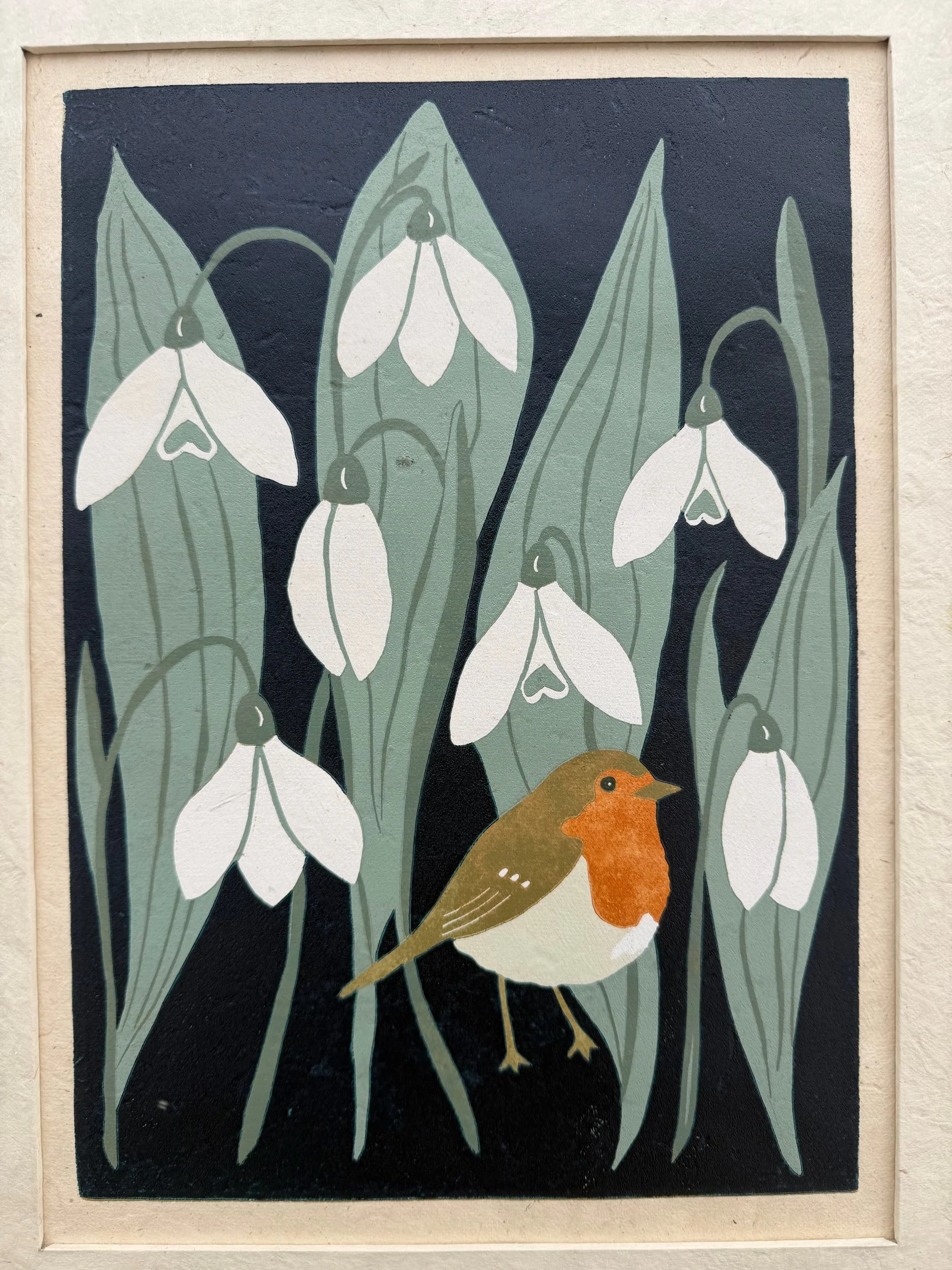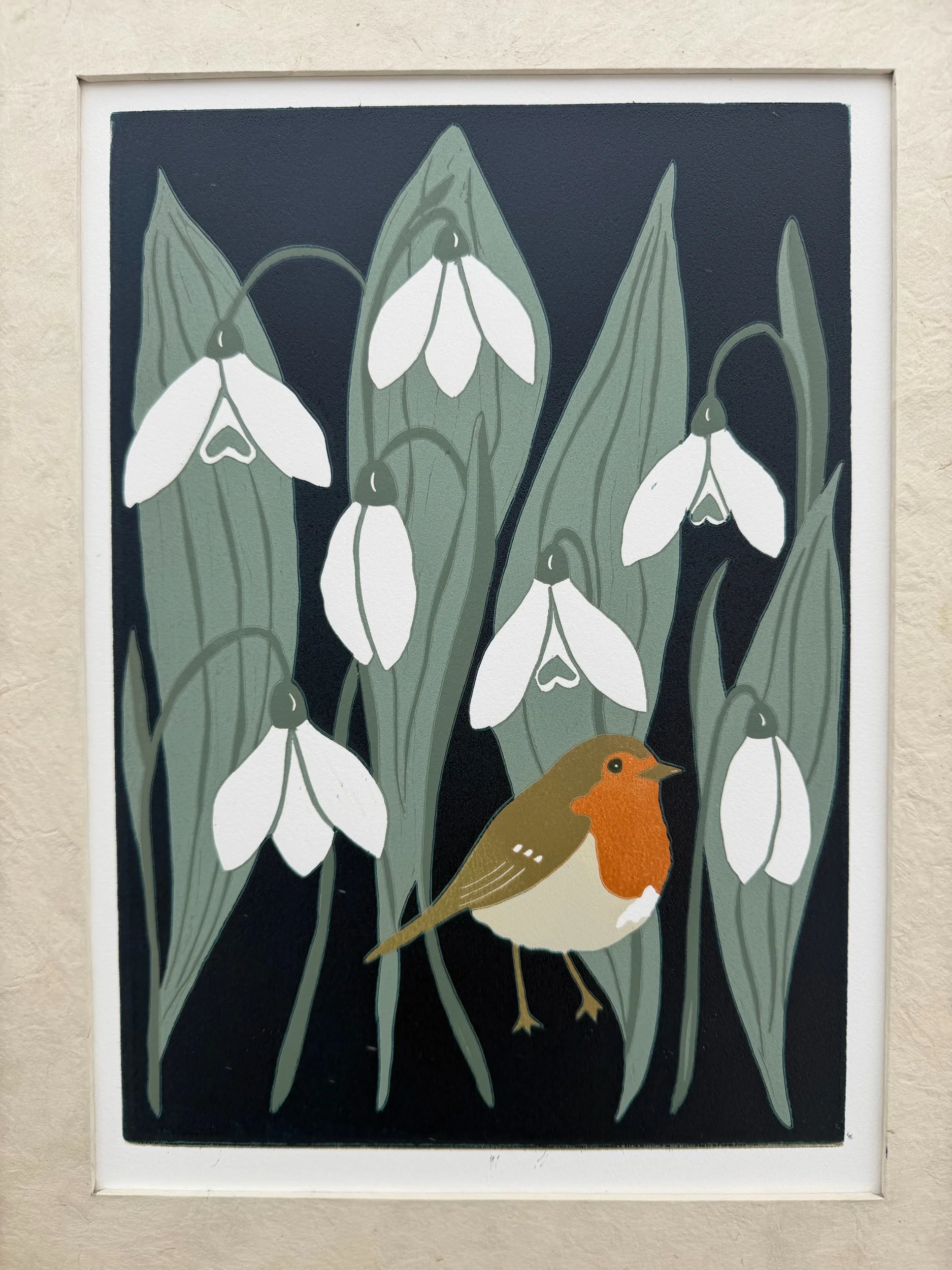 Handgedruckter Linolschnitt „Frühlingsbotin“ auf handgeschöpftem Loktapapier: Auflage von nur 30 Stück.