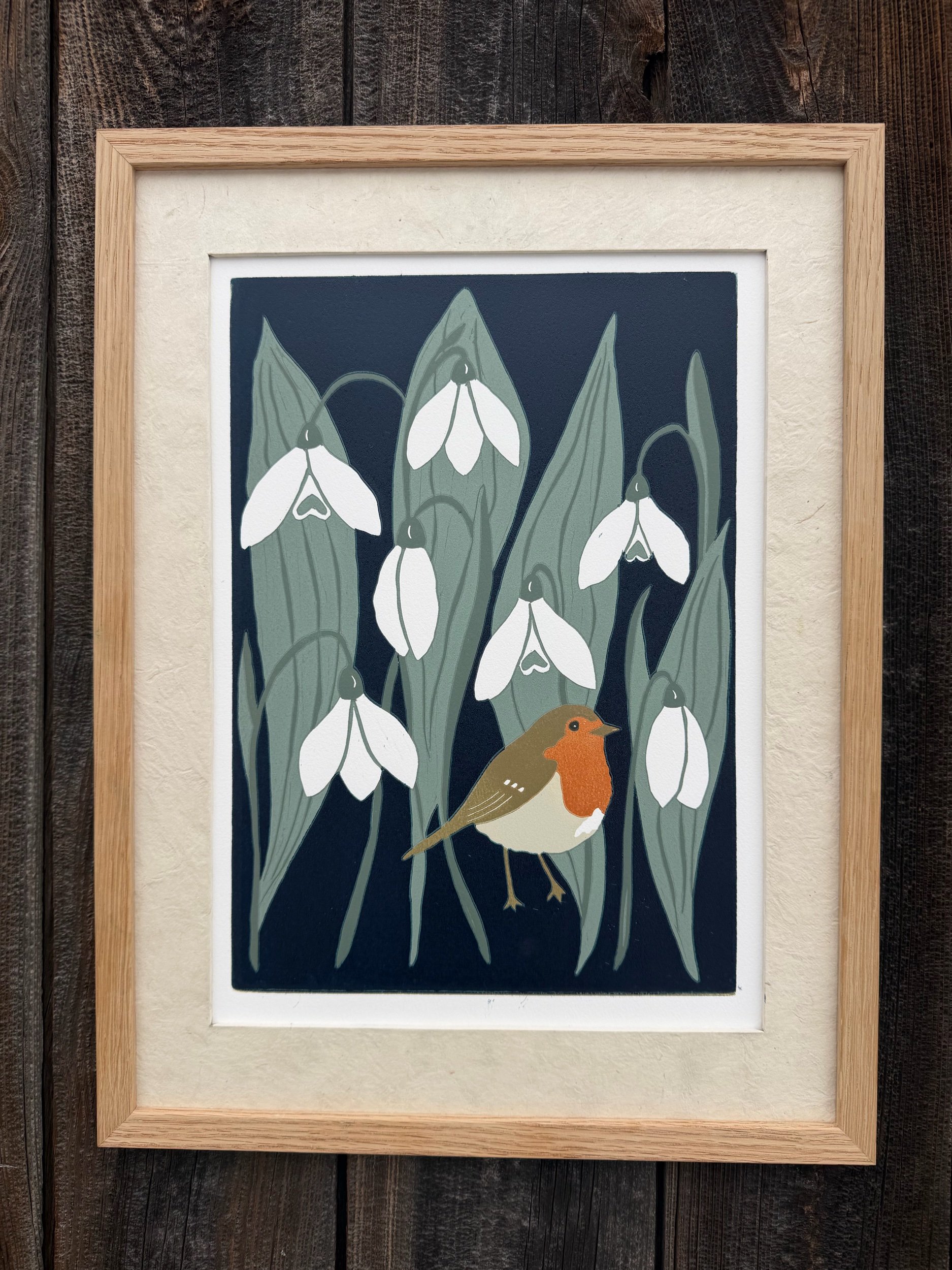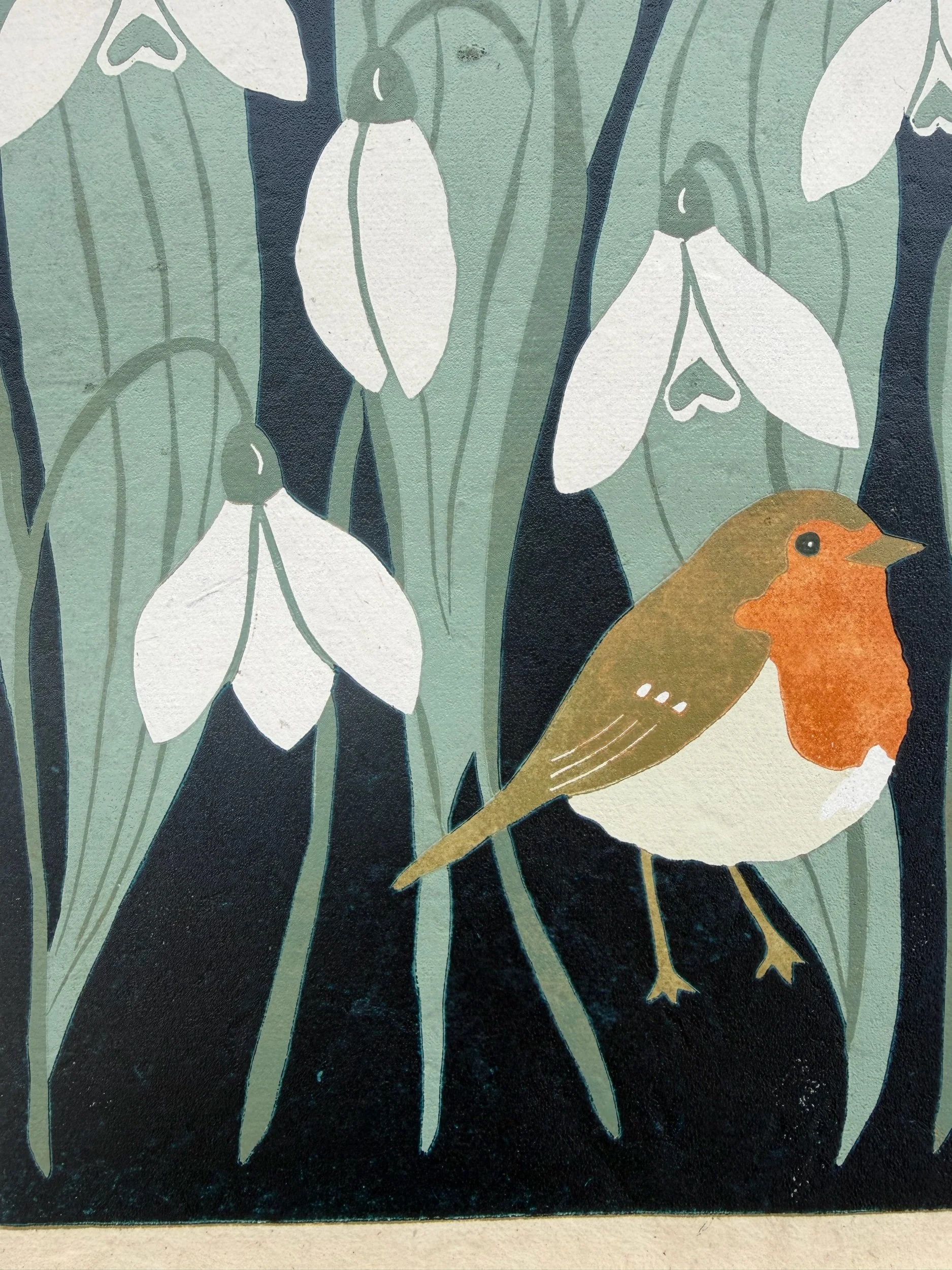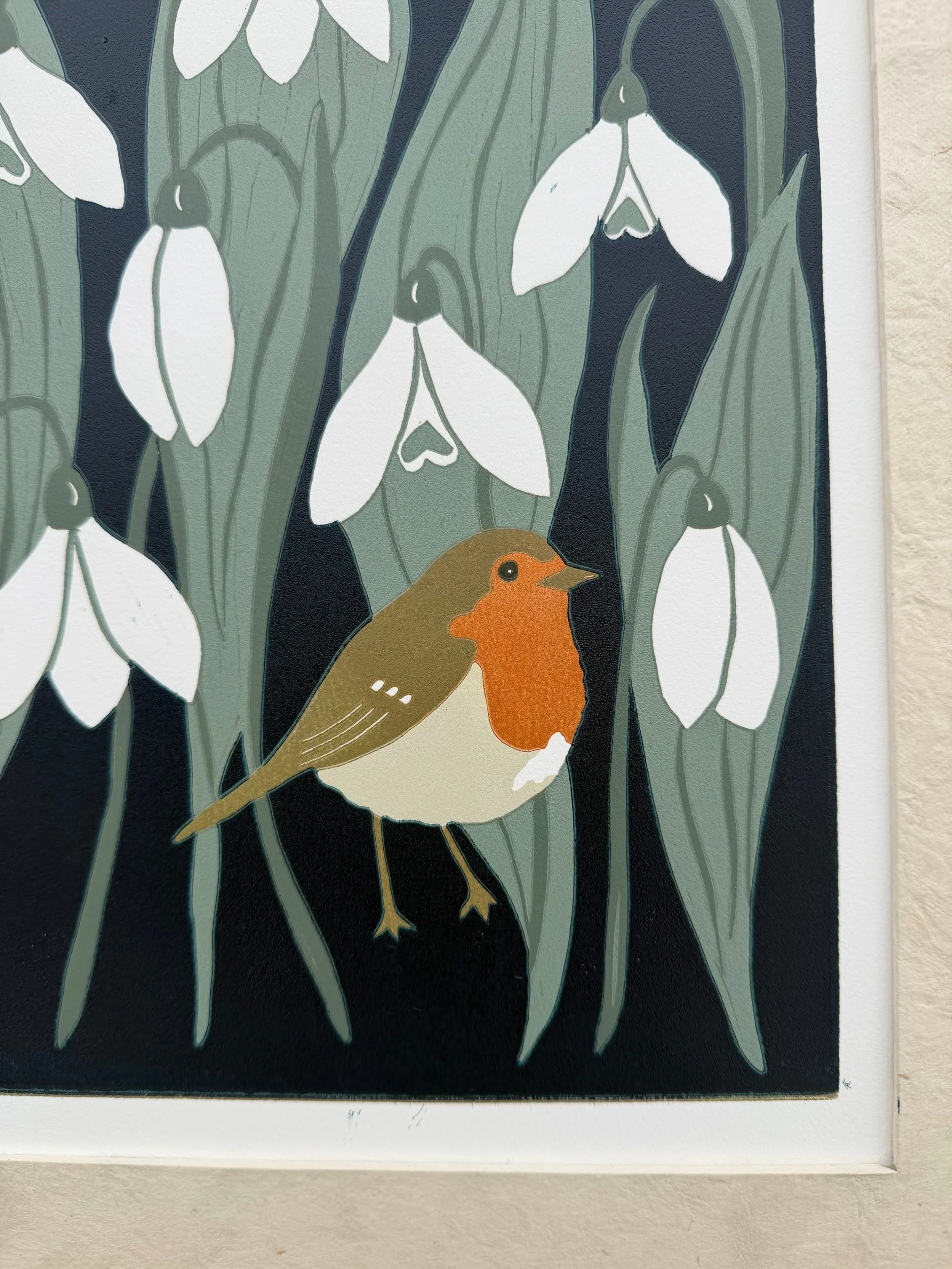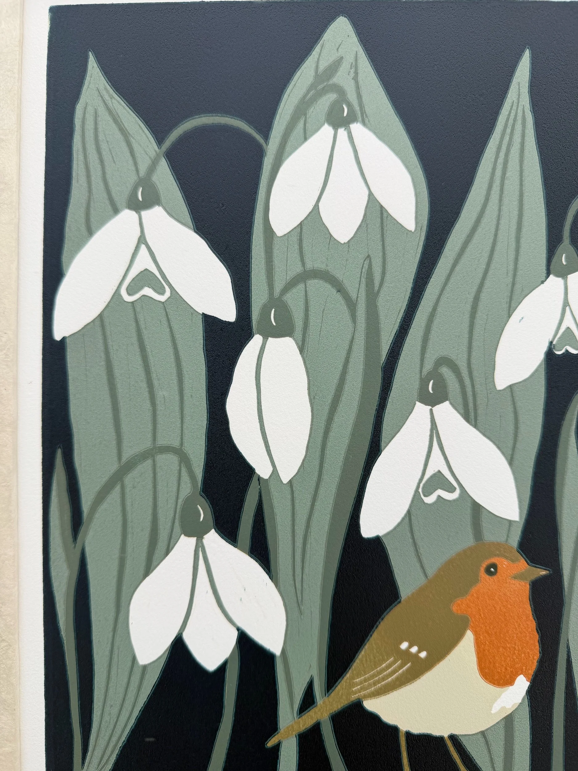 Handgedruckter Linolschnitt „Frühlingsbotin“ auf handgeschöpftem Loktapapier: Auflage von nur 30 Stück.