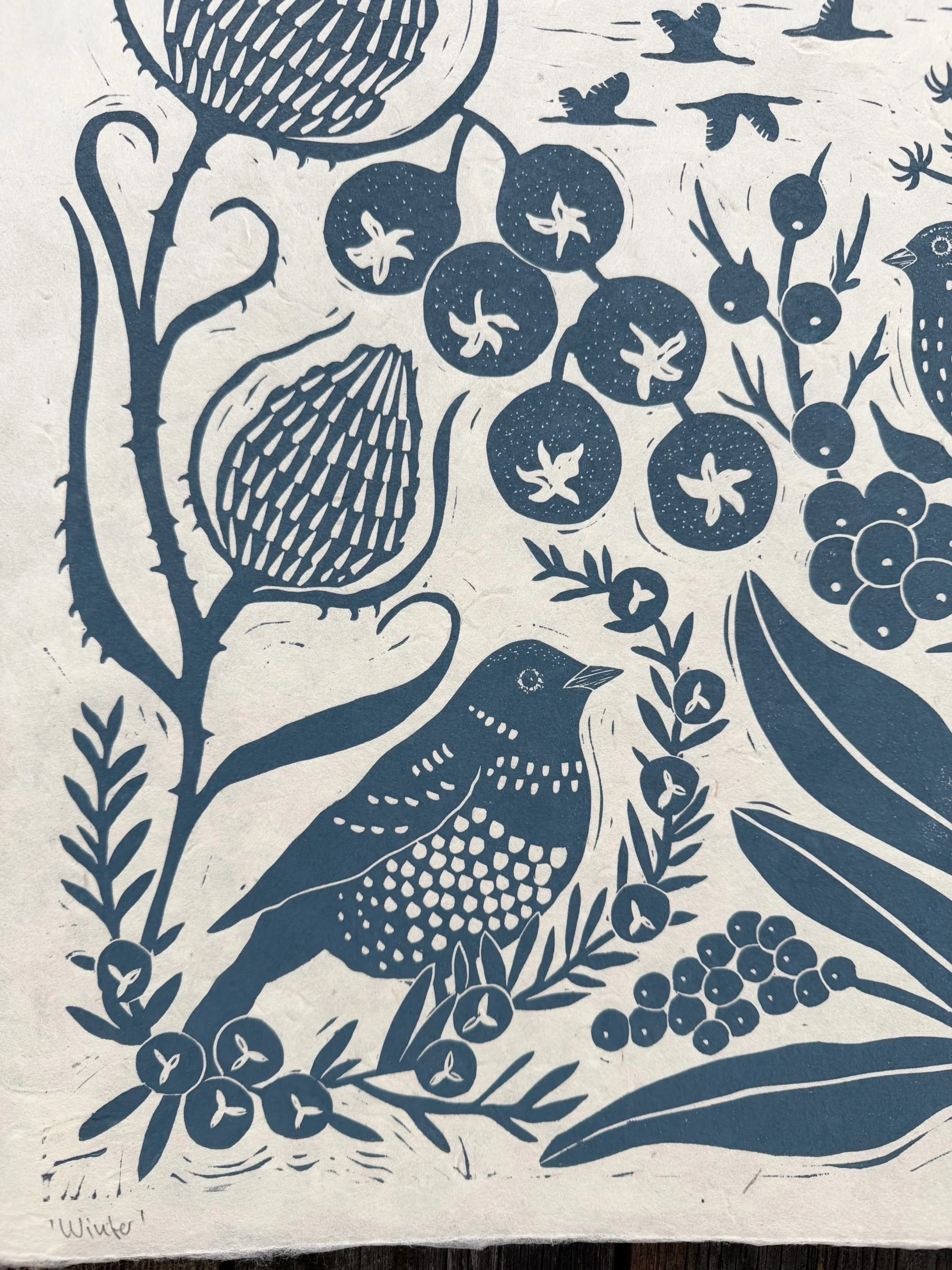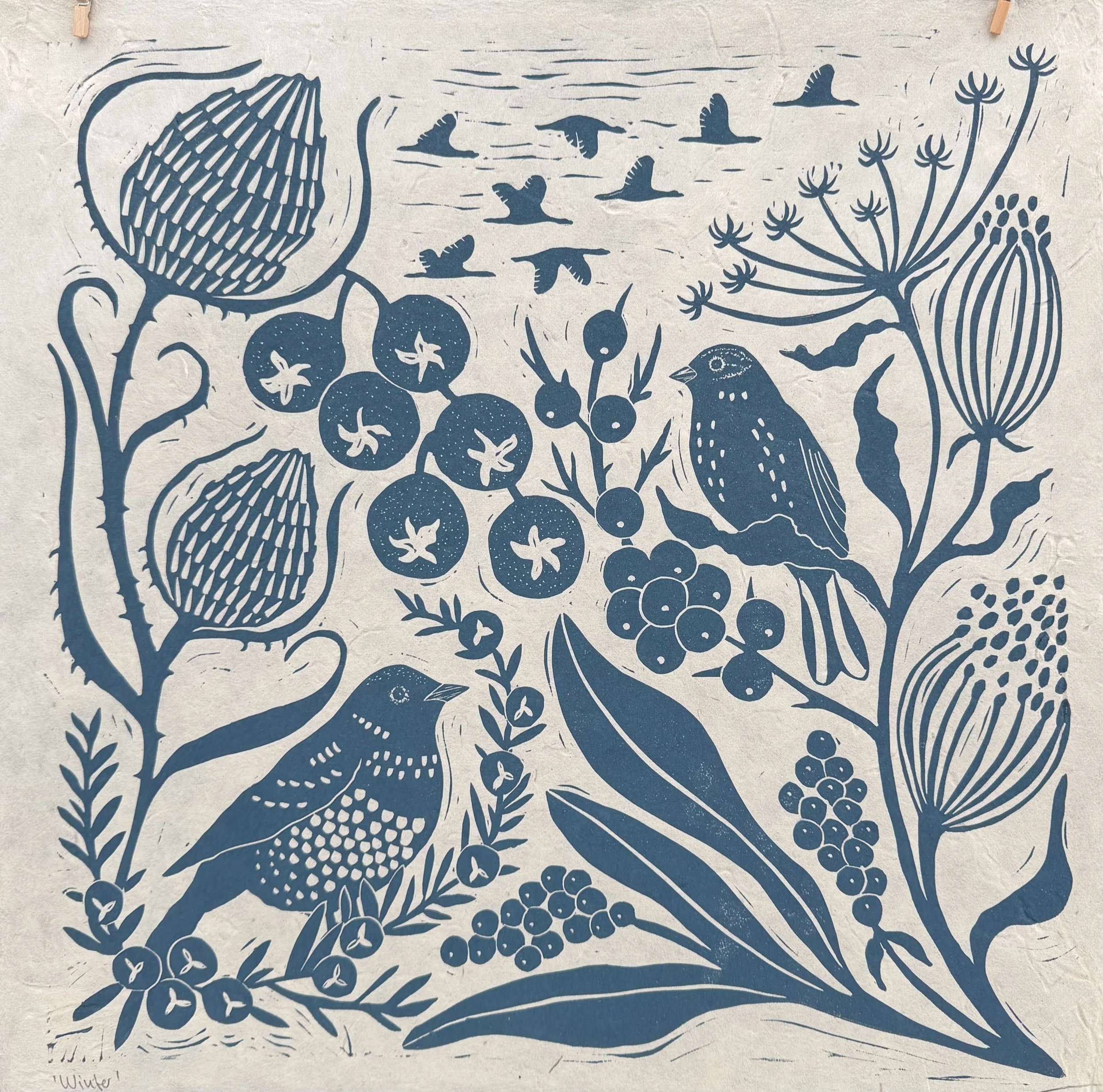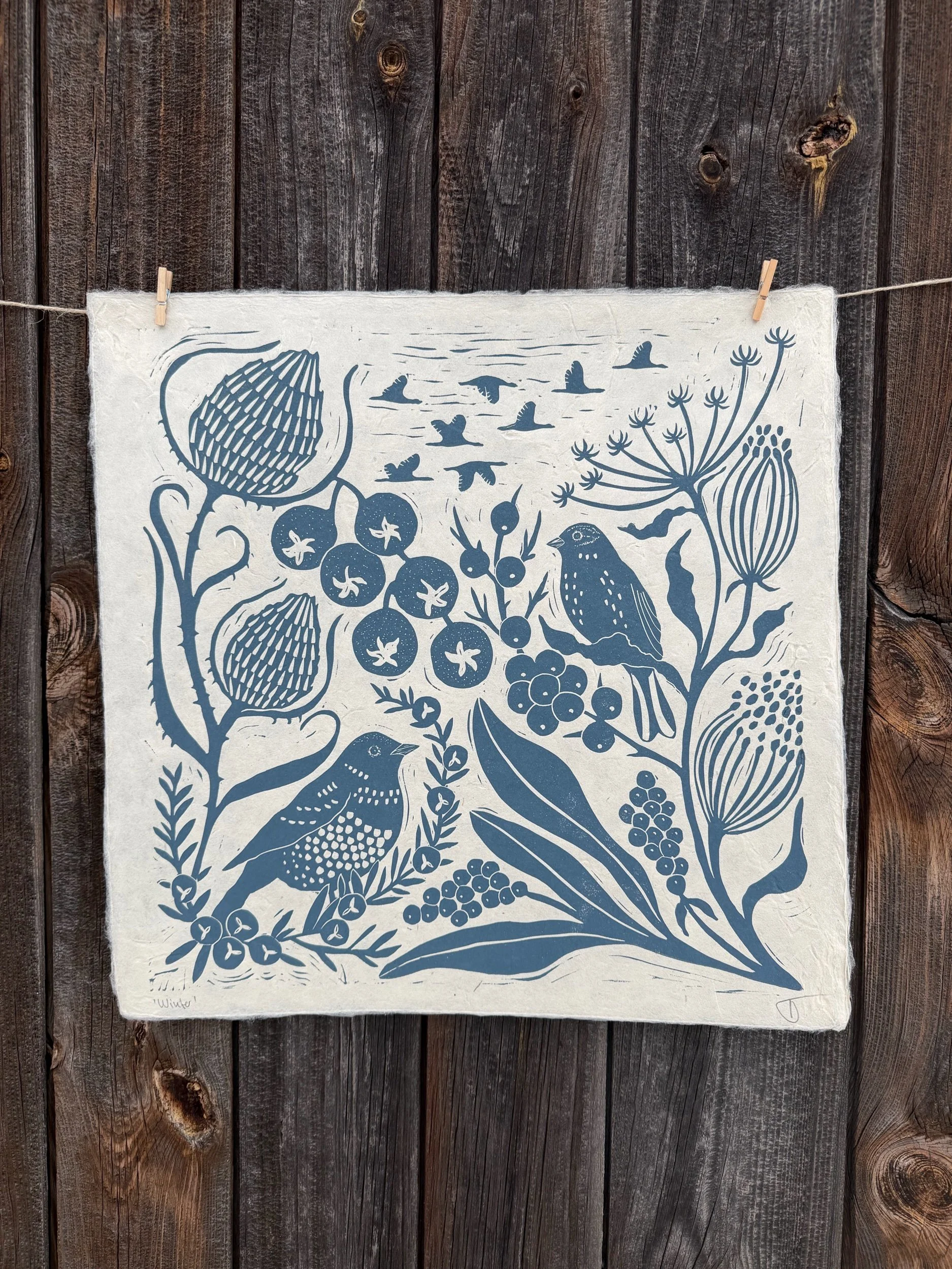 Handgedruckter Linolschnitt ,Winter‘ auf handgeschöpftem Loktapapier.