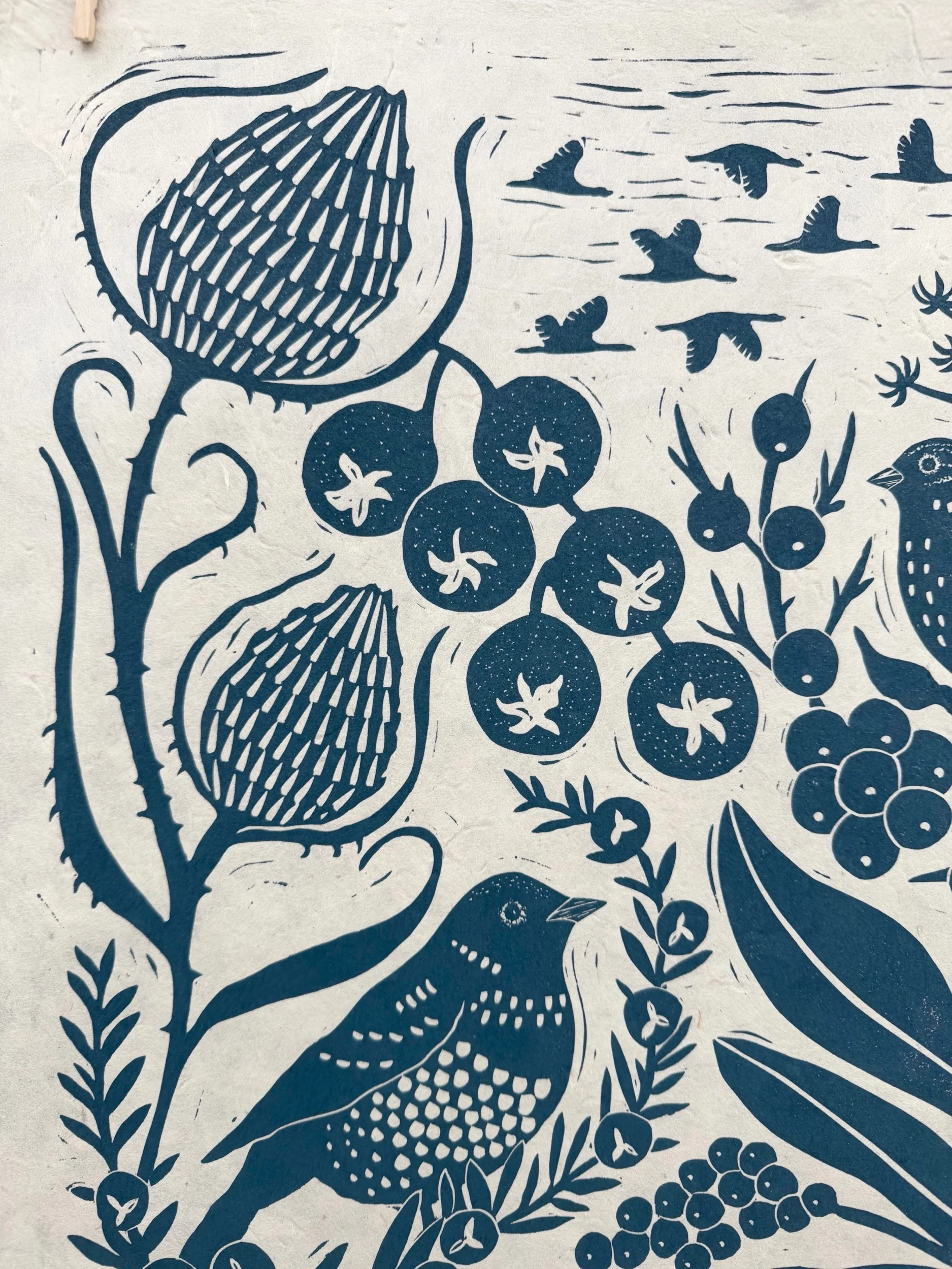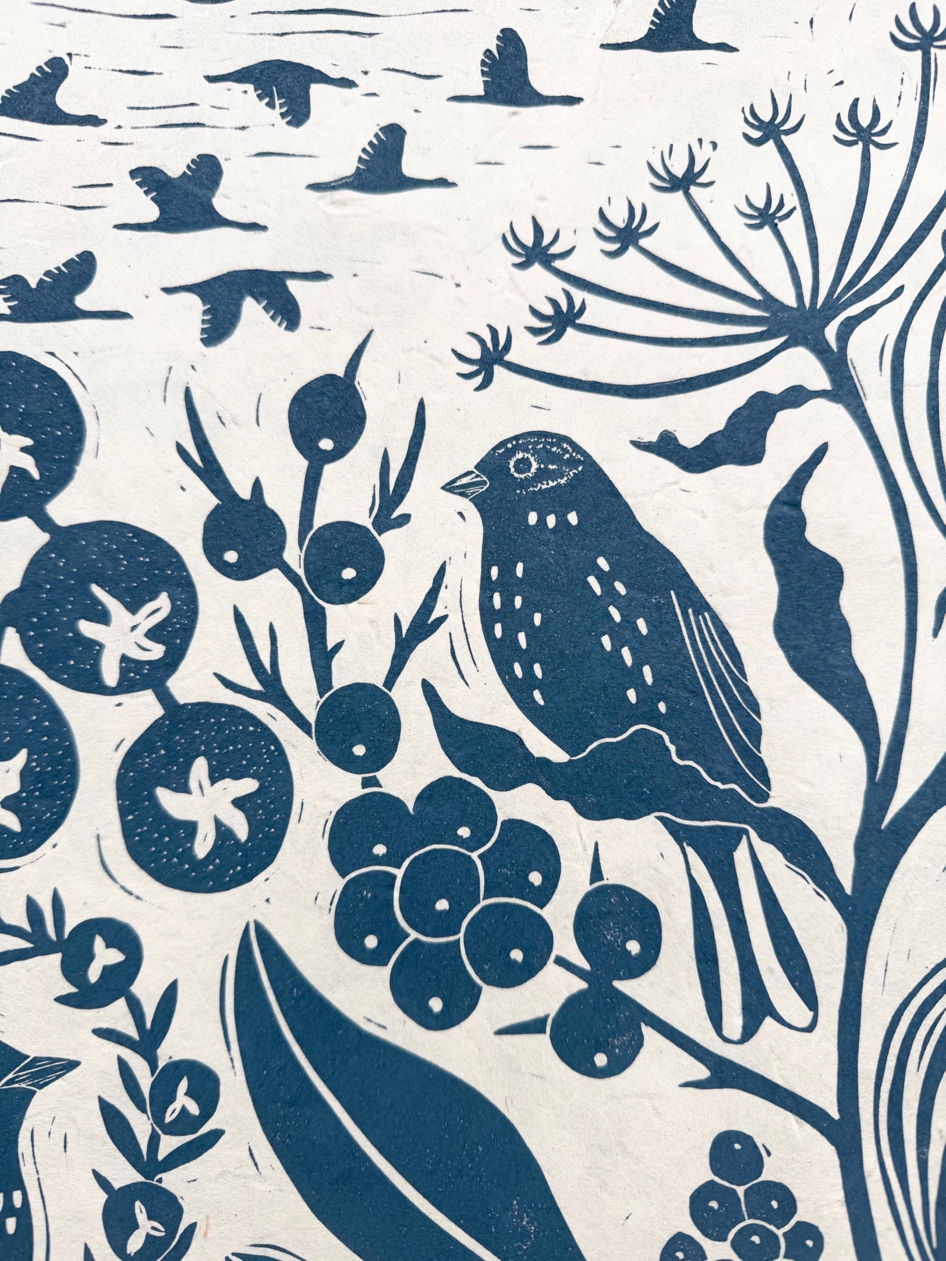 Jeder Druck wird von mir in meiner kleinen Werkstatt im Wendland entworfen, geschnitzt und handgedruckt. Die Farbe wird für jeden Druckdurchgang extra angemischt. Daher kann es zu leichten Farb- und Druckabweichungen kommen, jeder Druck ist ein Unikat.