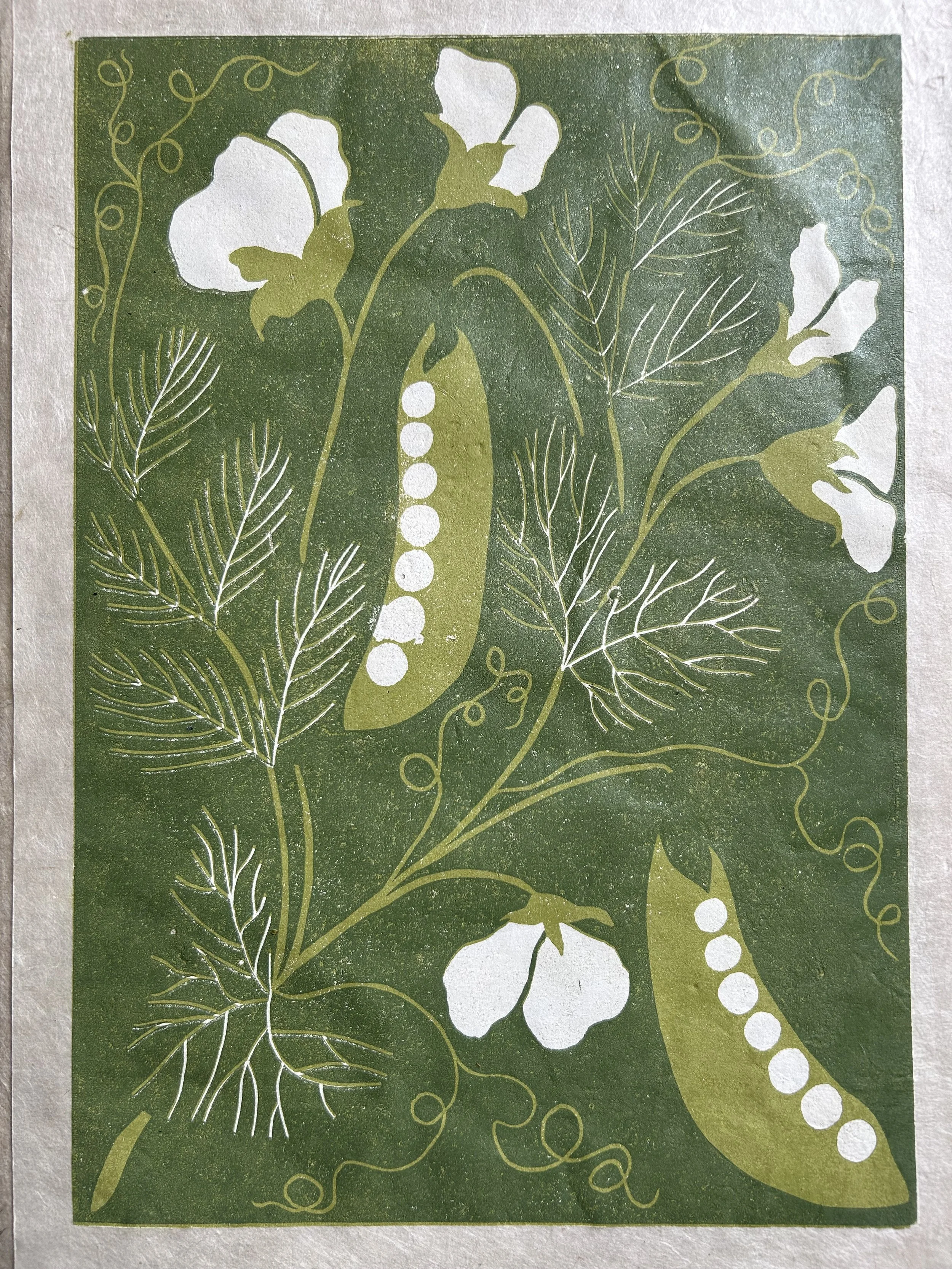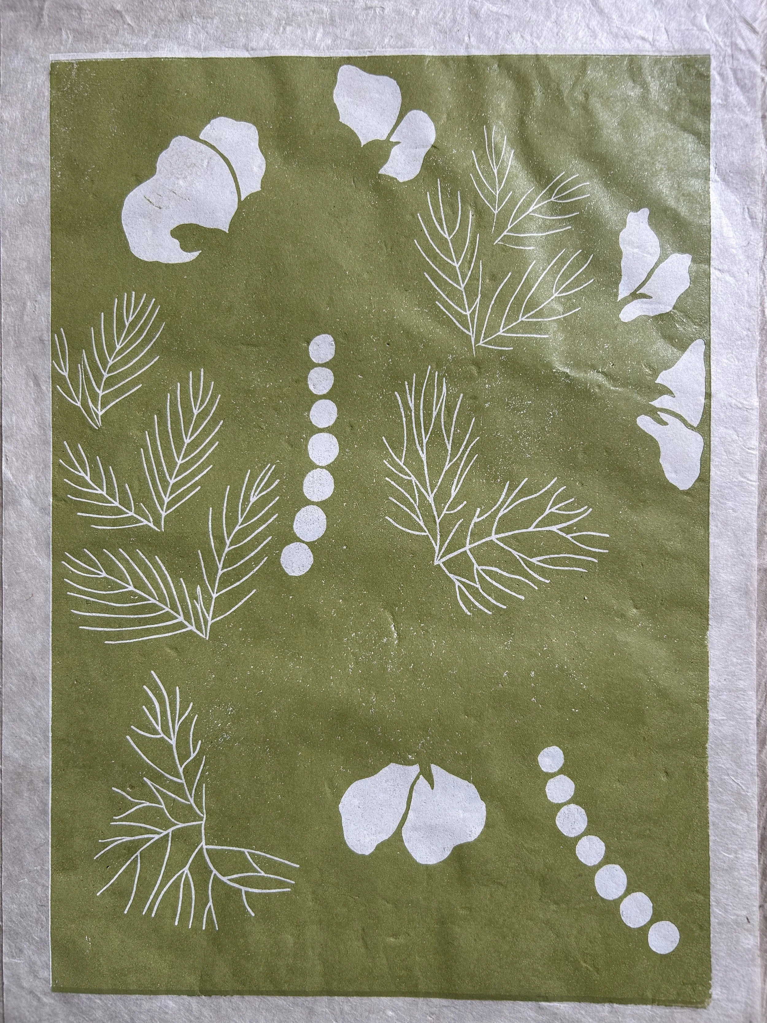Auf derselben Druckplatte wird nun alles weggeschnitzt was hellgrün bleiben soll und Dunkelgrün gedruckt.